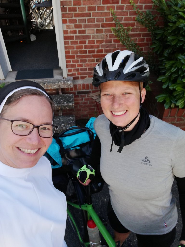 Da ich am nächsten Tag nur eine kurze Tour vor mir hatte, entschied ich mich noch eine Runde um den Dümmer See zu drehen, bevor ich mich auf den Weg nach Vechta zu meiner ersten Warmshowers Übernachtung machte. Warmshowers ist eine Plattform und Netzwerk von Radfahrbegeisterten, die anderen Radreisenden eine warme Dusche, eine Übernachtungsmöglichkeit und zum Beispiel eine Waschmaschine oder Werkzeug anbieten. Eben alles was man so als Radreisender benötigt. Übernachtet habe ich in einem Kloster bei Schwester Kerstin-Marie. Es war eine sehr spannende und coole Begegnung. Denn Kerstin-Marie ist selbst begeisterte Radfahrerin und fährt mit ihrem Gravel Bike auch mal Gravel Bike Rennen über mehrere hundert Kilometer an einem Tag mit. Dabei fährt sie in ihrem für Schwestern typischen Kleid und fällt natürlich damit sehr auf und kommt immer mit vielen Menschen ins Gespräch. Da sie noch einige Termine am späten Nachmittag/Abend hatte, kochte ich schon einmal für uns und später quatschten wir bei Abendessen und Wein bis spät abends.