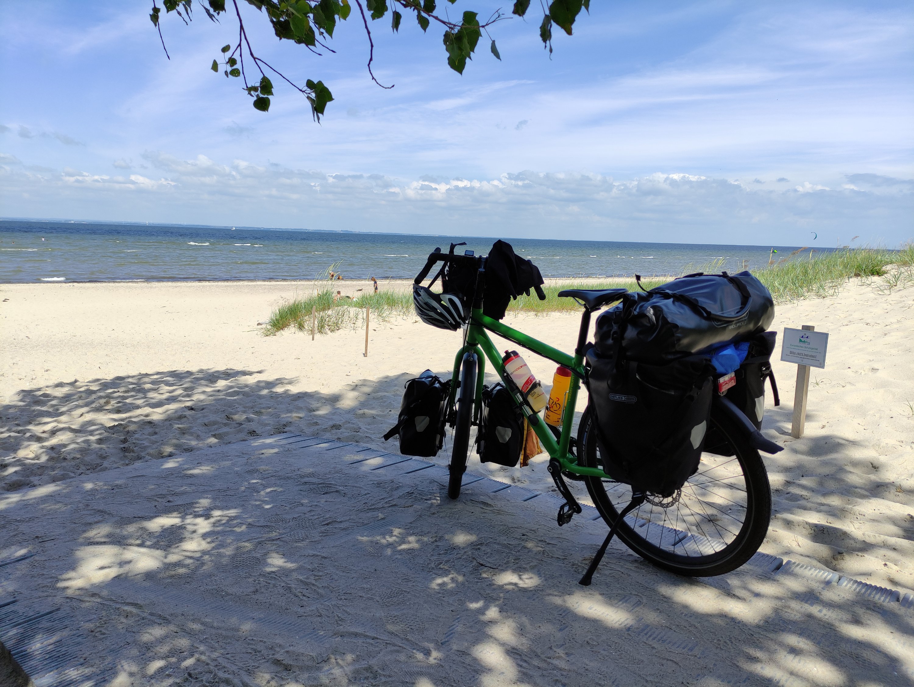 Am nächsten morgen, nahm ich mein Etappenziel „Ostsee“ in Angriff. Heute ging es endlich ans Meer und somit auf den Ostseeküstenradweg. Nach knappen 35km Fahrt konnte ich das Meer bereits in der Ferne sehen und die Vorfreude wuchs. Am Meer angekommen, ging es natürlich erst einmal für eine Pause direkt an den Strand – weißer Sand und nur wenige Menschen waren dort.