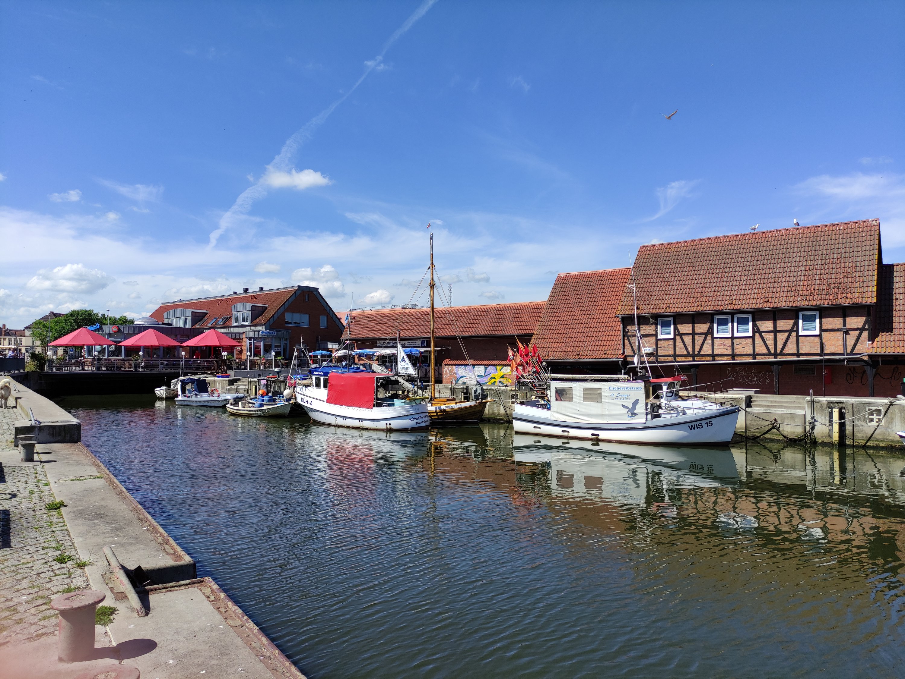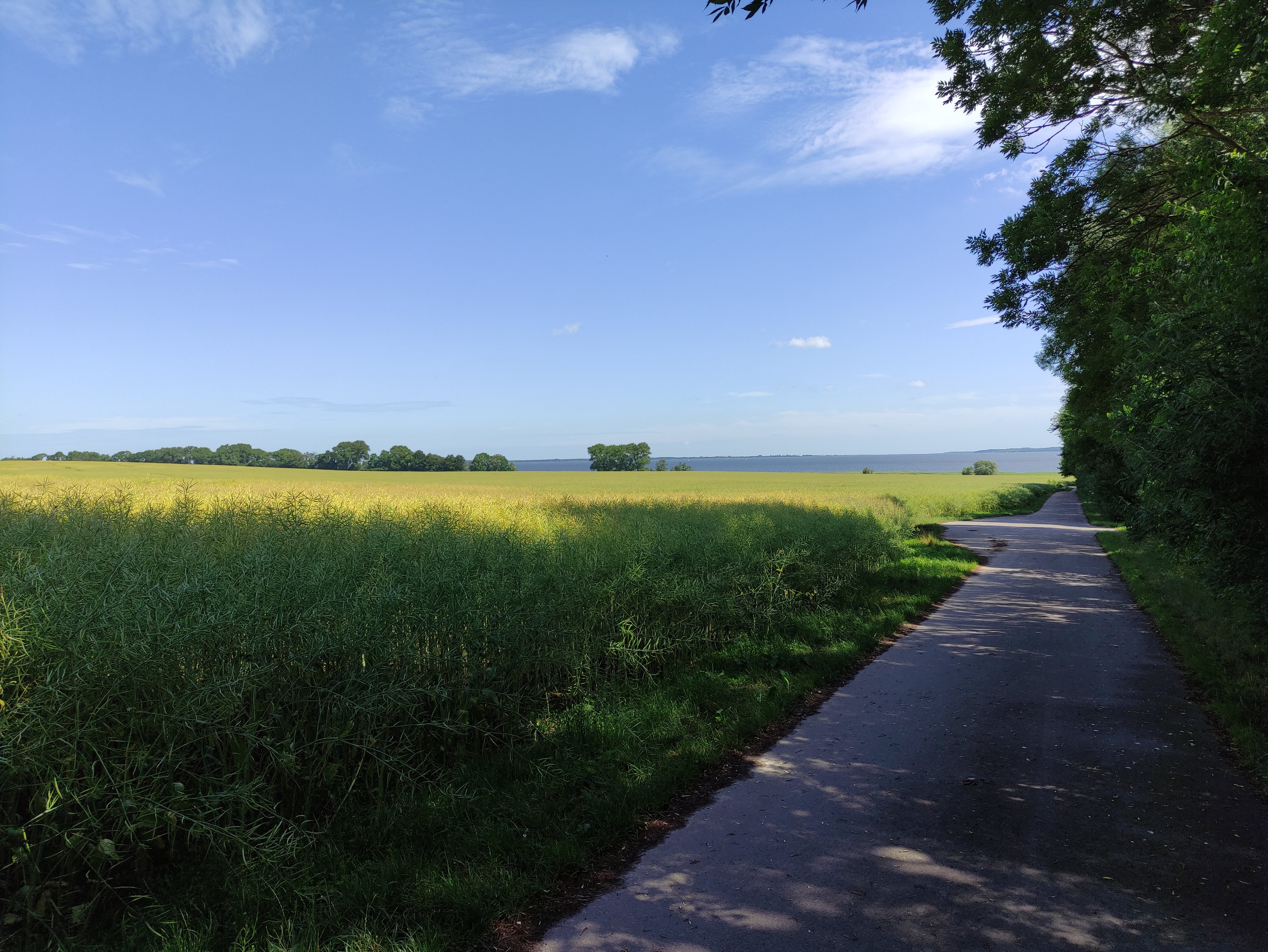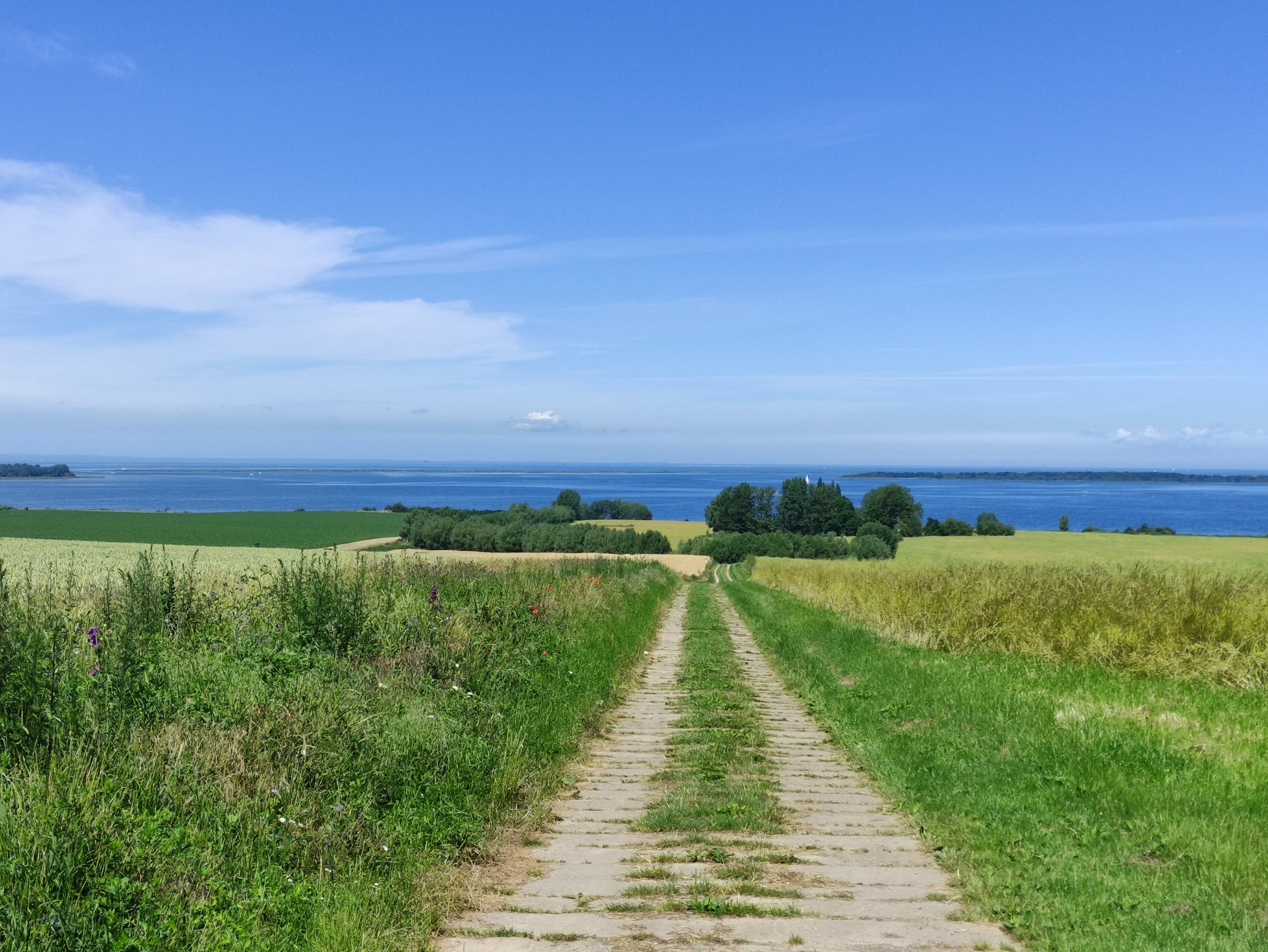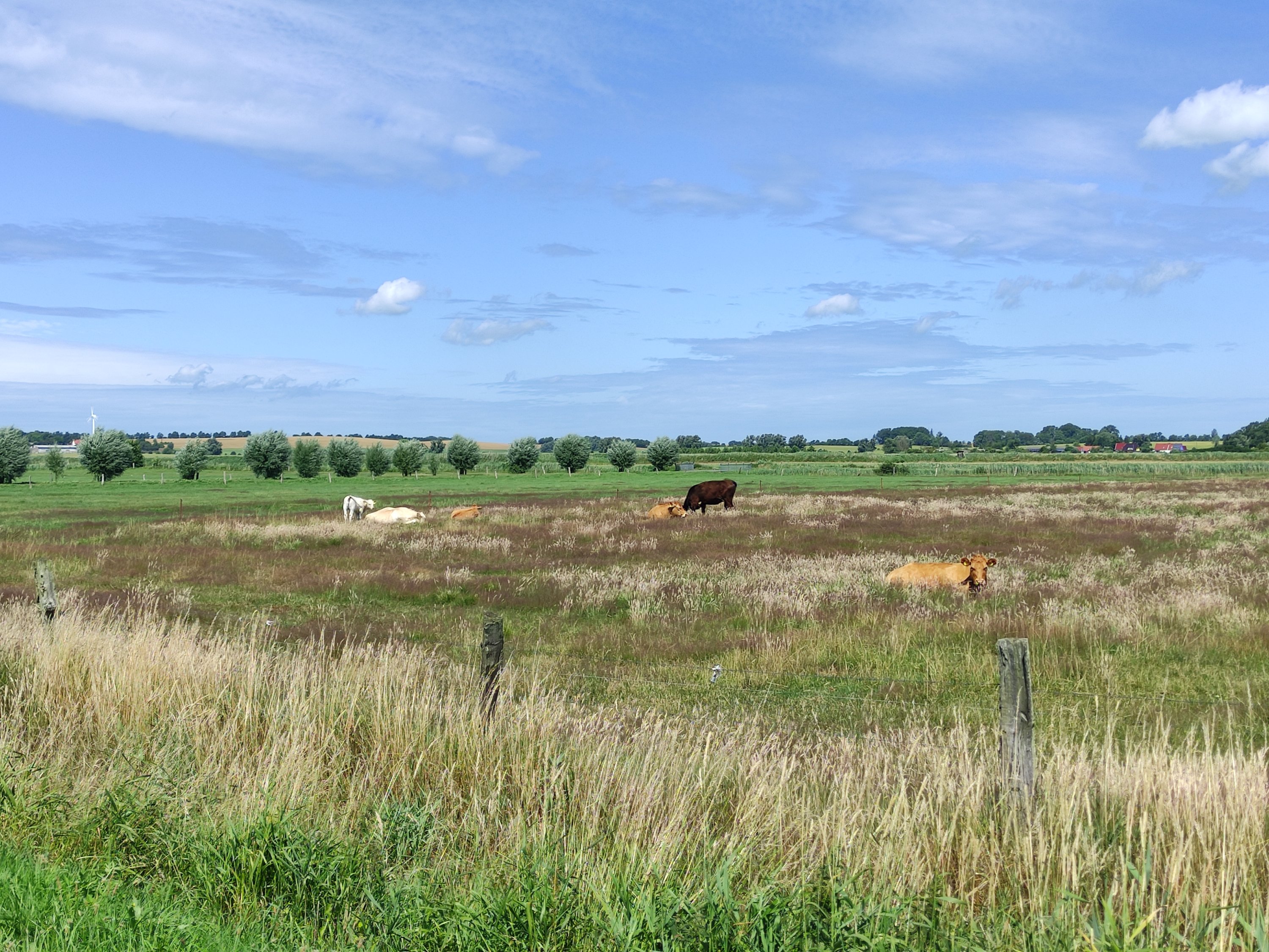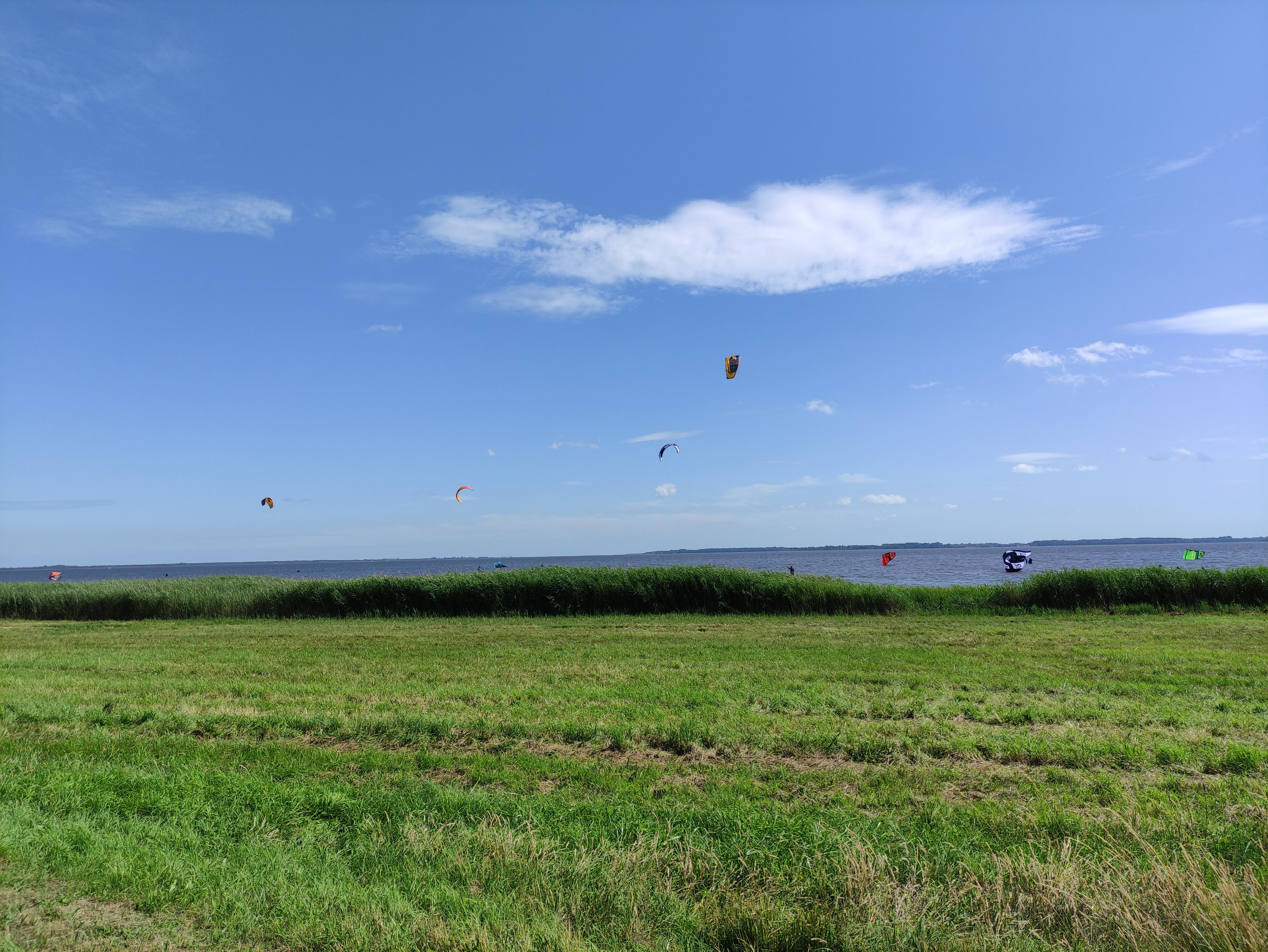Heute ging es von Prerow bis nach Klausdorf bei Stralsund. Es war zwar mit 52km nur eine kurze Tour, aber die richtig steife Brise und die Streckenführung machten die Etappe echt anstrengend. Gefühlt kam der Wind aus allen Richtungen – aber die Aussicht und die Landschaft waren wieder traumhaft schön und entschädigten für vieles. 😀 Als ich am Kite-Spot vorbei kam, wurde ich kurz neidisch – will auch!