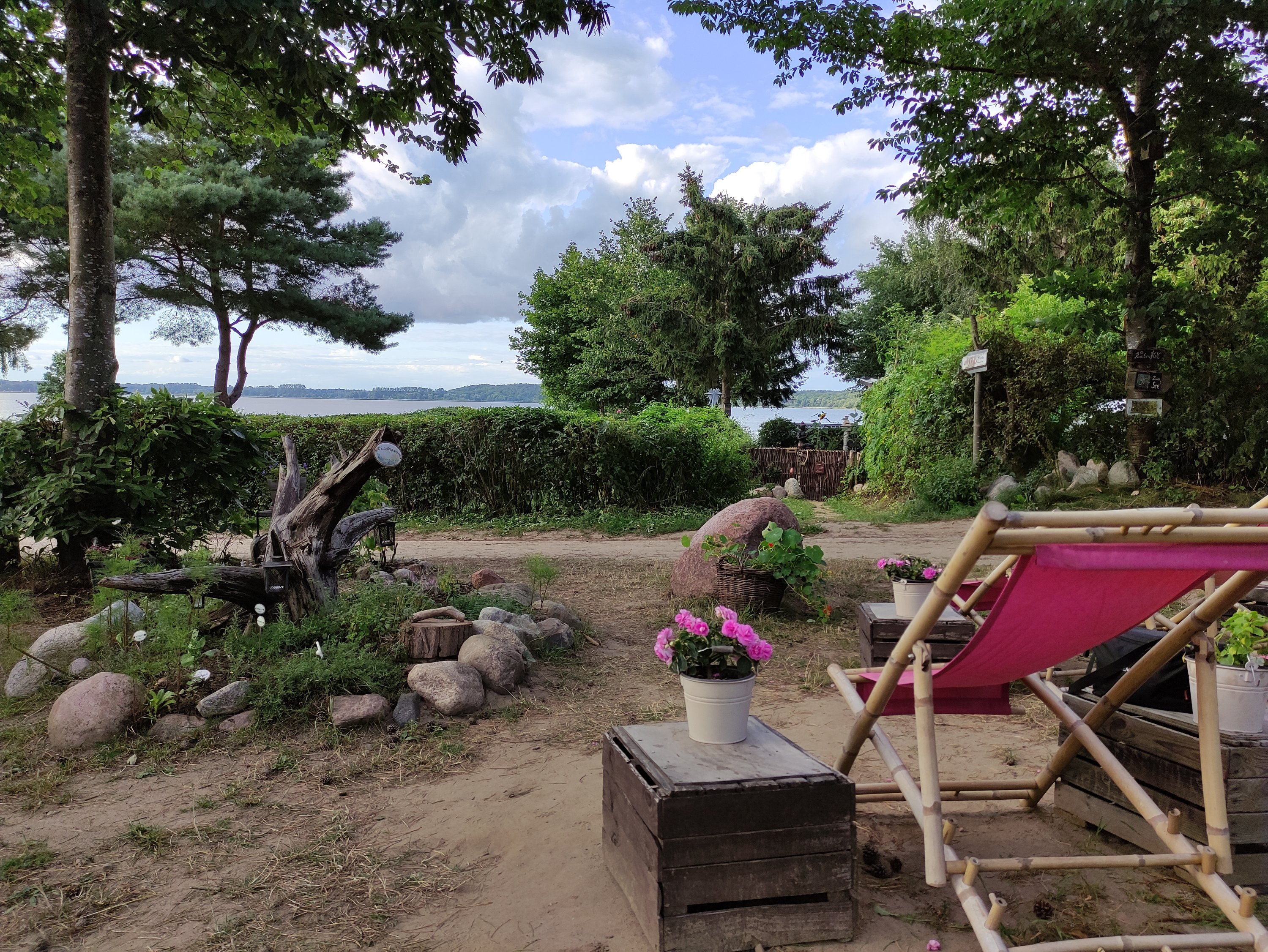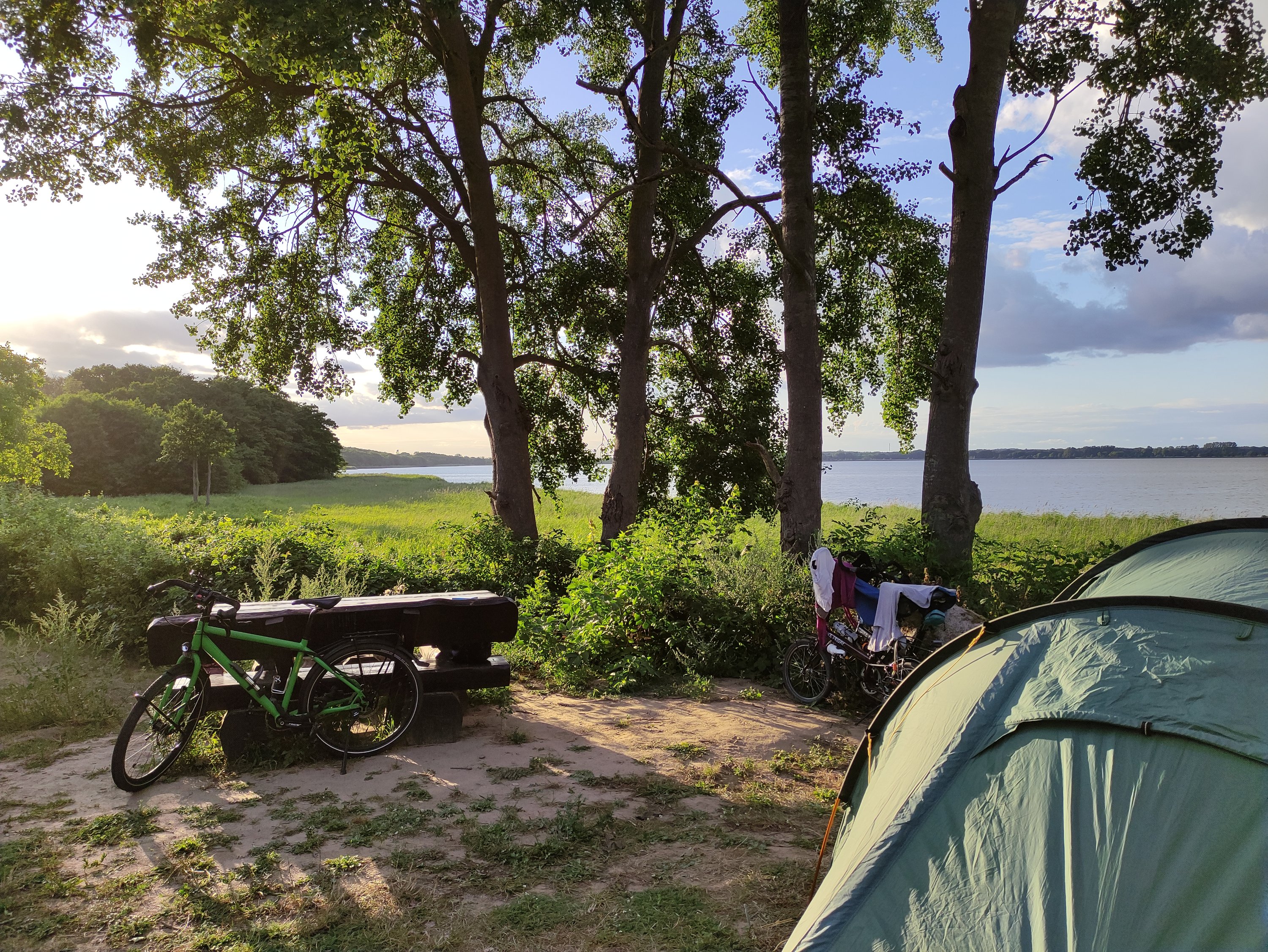 Über die Promenade in Ahlbeck sollte es zum Campingplatz gehen, jedoch war diese so gerappelt voll, dass ein Radfahren nicht möglich war. Also ging es dann auf Parallelstraßen nach Sellin auf den Campingplatz Nandalee. Sellin ist etwas abseits vom Trubel an der Küste und der Campingplatz hat einen super Eindruck auf der Homepage gemacht – und ich wurde nicht enttäuscht. Der Campingplatz ist klein und familiär und mein Zelt konnte ich direkt am Wasser aufstellen, sodass ich einen super Blick über den Schmollensee hatte. Außerdem betreiben die Besitzer auch ein kleines Bistro auf dem Platz, dass die Gäste mit richtig leckerem Essen und Trinken versorgt.