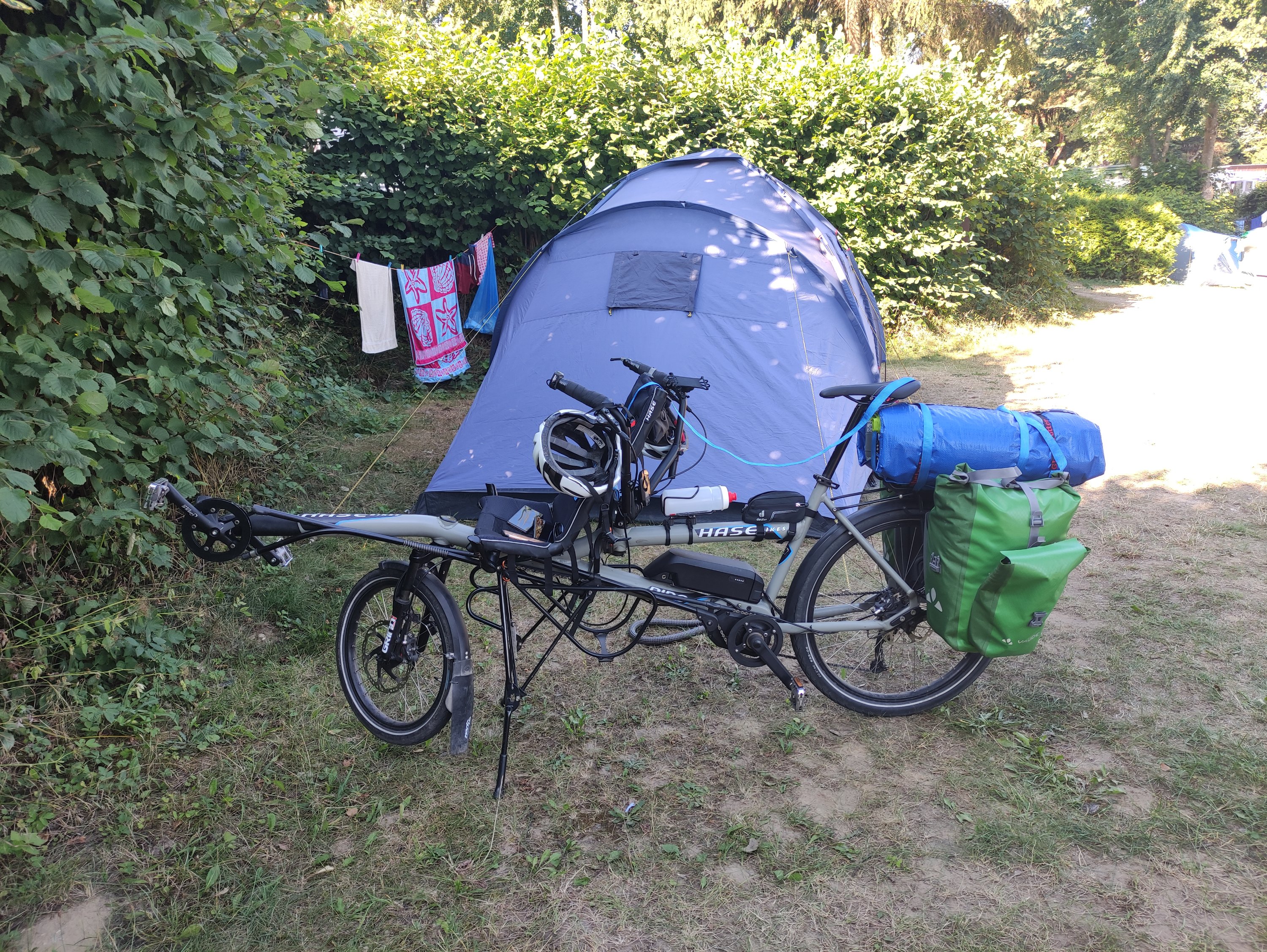 Am zweiten Abend wurde es dann nochmal spannend auf dem Campingplatz. Ich hatte am Abend zuvor per E-Mail angefragt, ob sie denn noch Platz hätten, für eine Person im Zelt mit dem Rad. Die Antwort hatte ich morgens schon im E-Mail Posteingang – das sei kein Problem sie haben Platz. Als ich dann ankam, wurden mir dann zweit Stellplätze angeboten. Die erste Option: in der Mitte von 4 anderen Zelten, wobei dann mein Zelt vermutlich so ca 5cm Abstand zum jeweiligen Nachbarzelt gehabt hätte (auf dem Bild zwischen dem hellgrünen und dem blauen Zelt). Oder die zweite Option: auf einem kleinen Grünstreifen, neben einem kleinen Mobile-Home und neben Autos und vor allem neben dem Kinderspielplatz, auf dem die Hölle los war. Also stand ich zwischen der Wahl: Pest oder Cholera. 😀 Ich habe mit dem Platz neben dem Kinderspielplatz die Pest gewählt in der Hoffnung, dass die Kleinen ja irgendwann mal schlafen müssen – das war dann so gegen 23 Uhr 😀