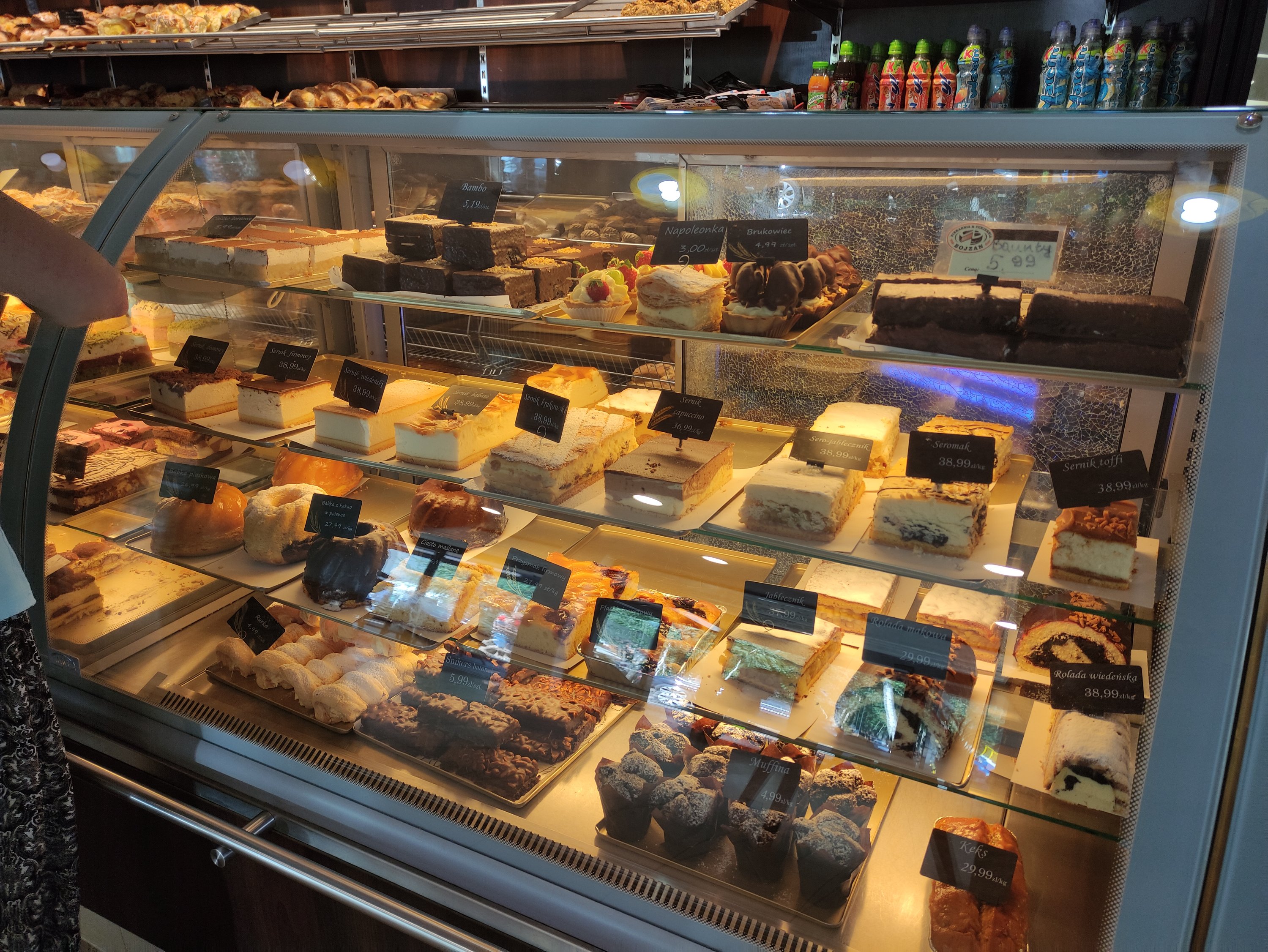 Ich fühlte mich überhaupt nicht wohl und entschied noch weitere 25km zum nächsten Campingplatz zu fahren, den ich mir rausgesucht hatte. Doch zunächst brauchte ich erst einmal ein wenig Stärkung, denn die Tour zerrte sehr an meinen Kräften. Also suchte ich mir eine Bäckerei und es gab erst einmal Kuchen und einen Cappuccino. Die Auswahl an Kuchen hier in Polen ist der Wahnsinn. So viele verschiedene Kuchen, Torten, Törtchen hab ich noch nicht gesehen. Wenn die Polen was können, dann ist es Kuchen backen 😀 . Die Stückchengröße kann man selbst bestimmen und der Preis wird dann anhand des Gewichtes berechnet.