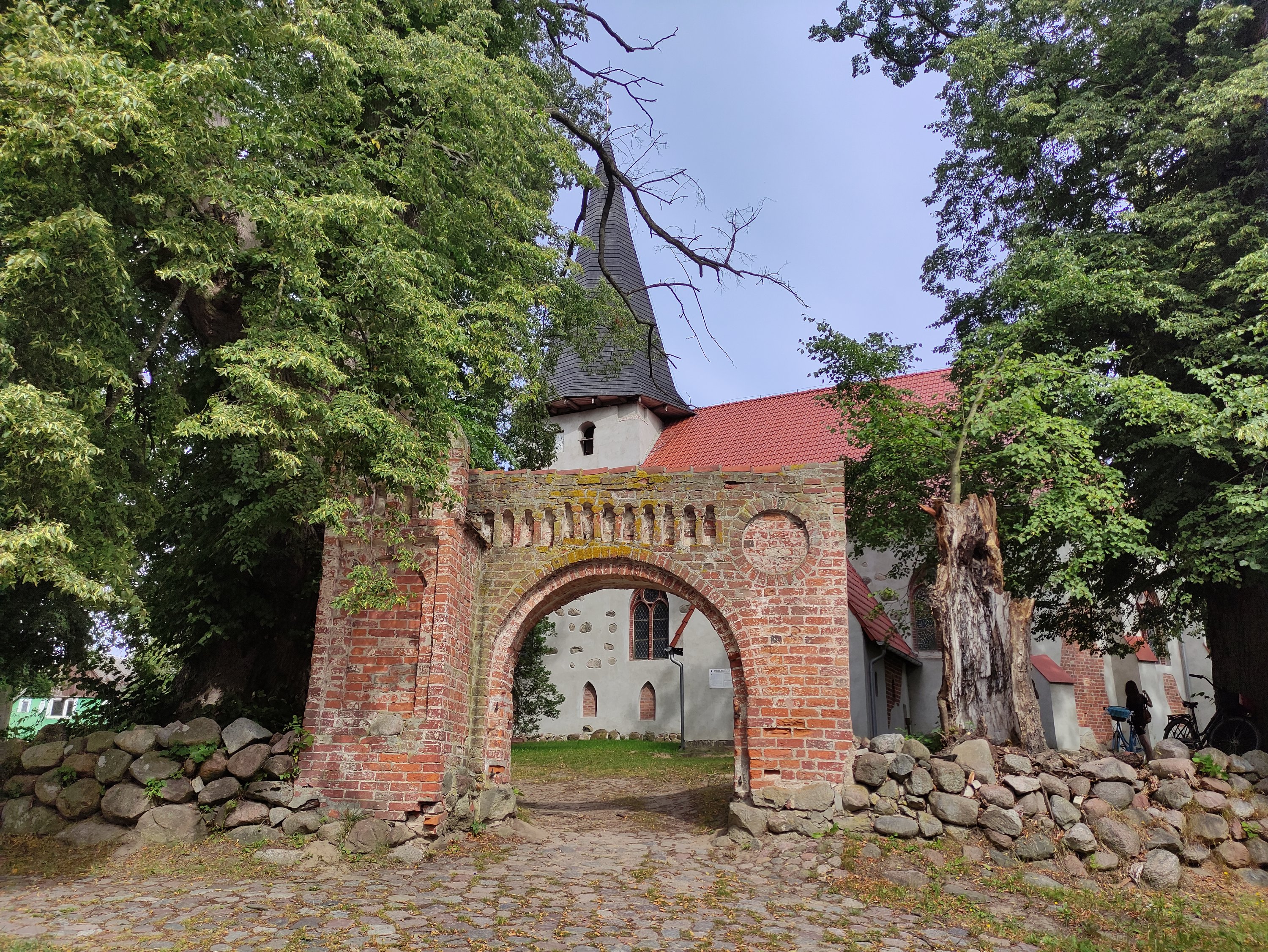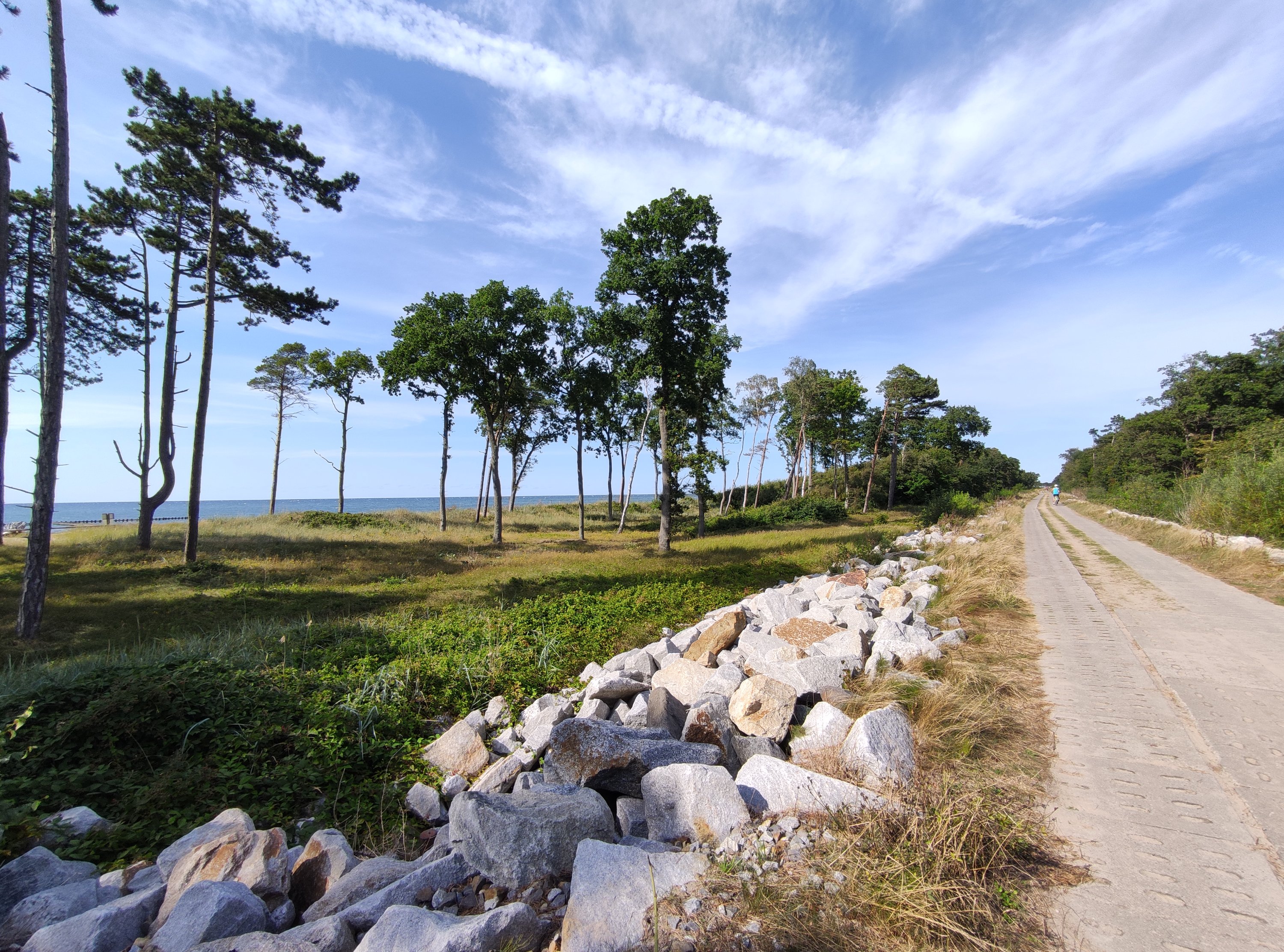 Auf dem Weg hierhin verließ ich den Ostseeküstenradweg, da auf der weiteren Tour auf Komoot eine Passage als fast unpassierbar beschrieben wurde: Sumpf, Schlamm, Fahrrad und Gepäck tragen. Da ich mir das nicht antun wollte, suchte ich mir eine Route über kleine Nebenstraßen und Dörfer. Umso überraschter schaute ich, als ich auf einmal am Wegesrand wieder die Schilder vom EV10/13 und vom R10 gefunden habe. Anscheinend haben Sie die Route umgeplant, aber das Kartenmaterial in der OpenCycleMap hat noch niemand angepasst und so war ich völlig allein unterwegs. 🙂 Auf dieser Tour hat es mich dann auch das erste Mal mit dem Rad hingehauen, denn die Kombi aus Kopfsteinpflaster und tiefen Sand war nicht so toll. Aber zum Glück ist nichts weiter passiert und die Tour konnte gleich weitergehen.