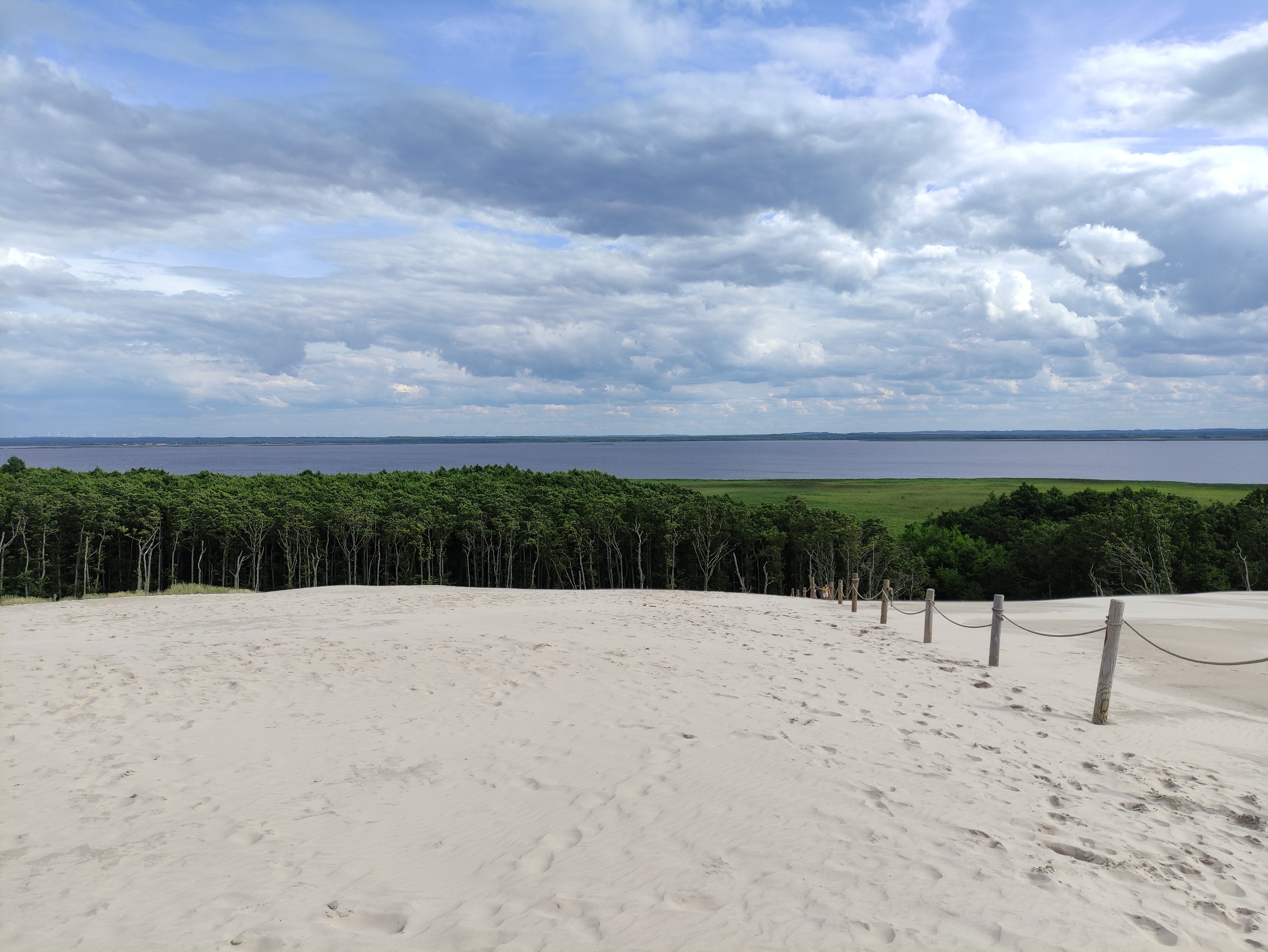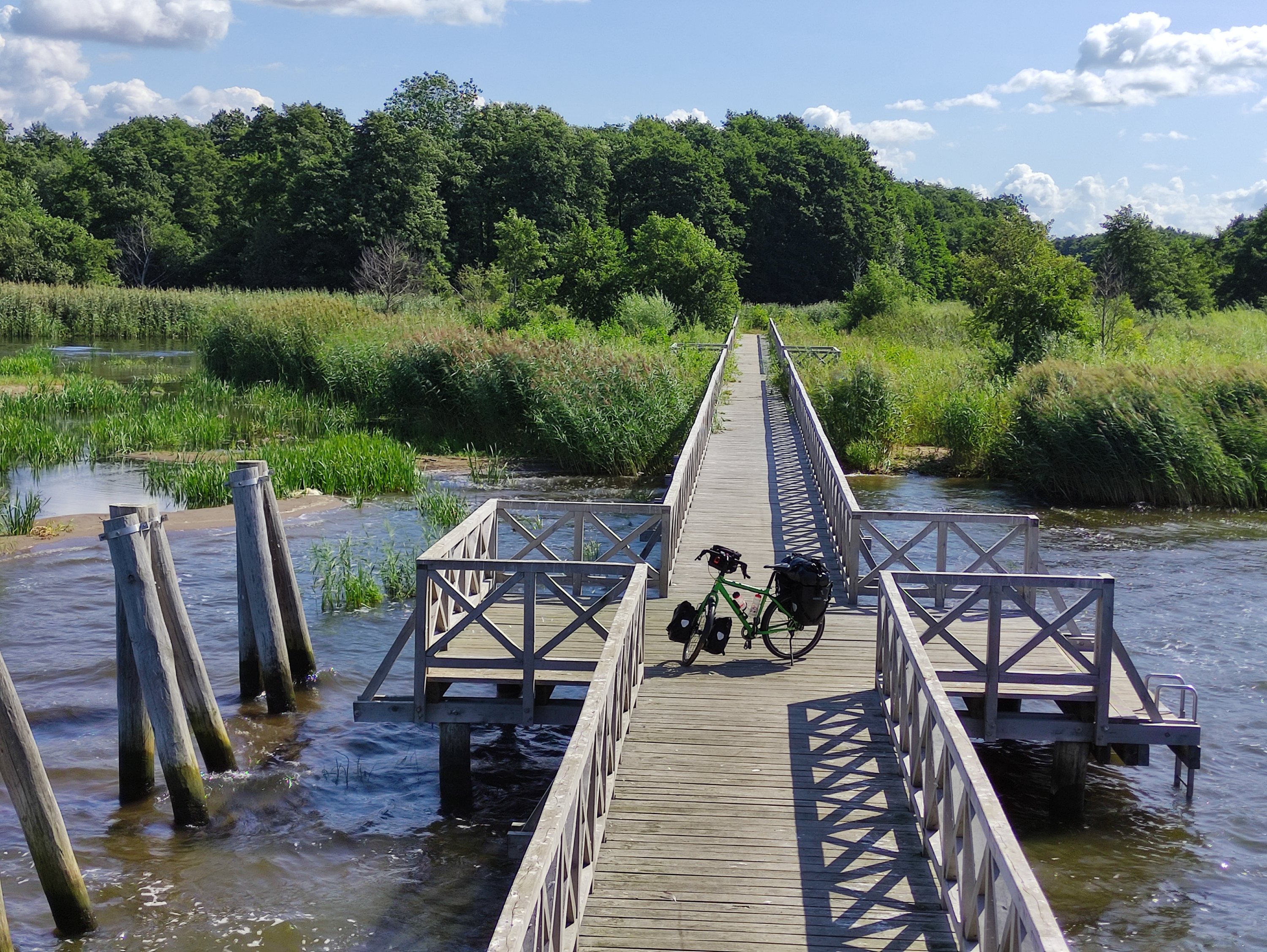 Gestärkt und erholt vom Ruhetag hieß es nun wieder in die Pedalen zu treten – Ziel für heute war Leba, denn da wollte ich mir die größte Wanderdüne Europas anschauen. Auf dem Weg dahin entdeckte ich einen Steg, der auf den See Lebsko führte, von dem aus ich am Horizont auch schon die Sanddünen sehen konnte.