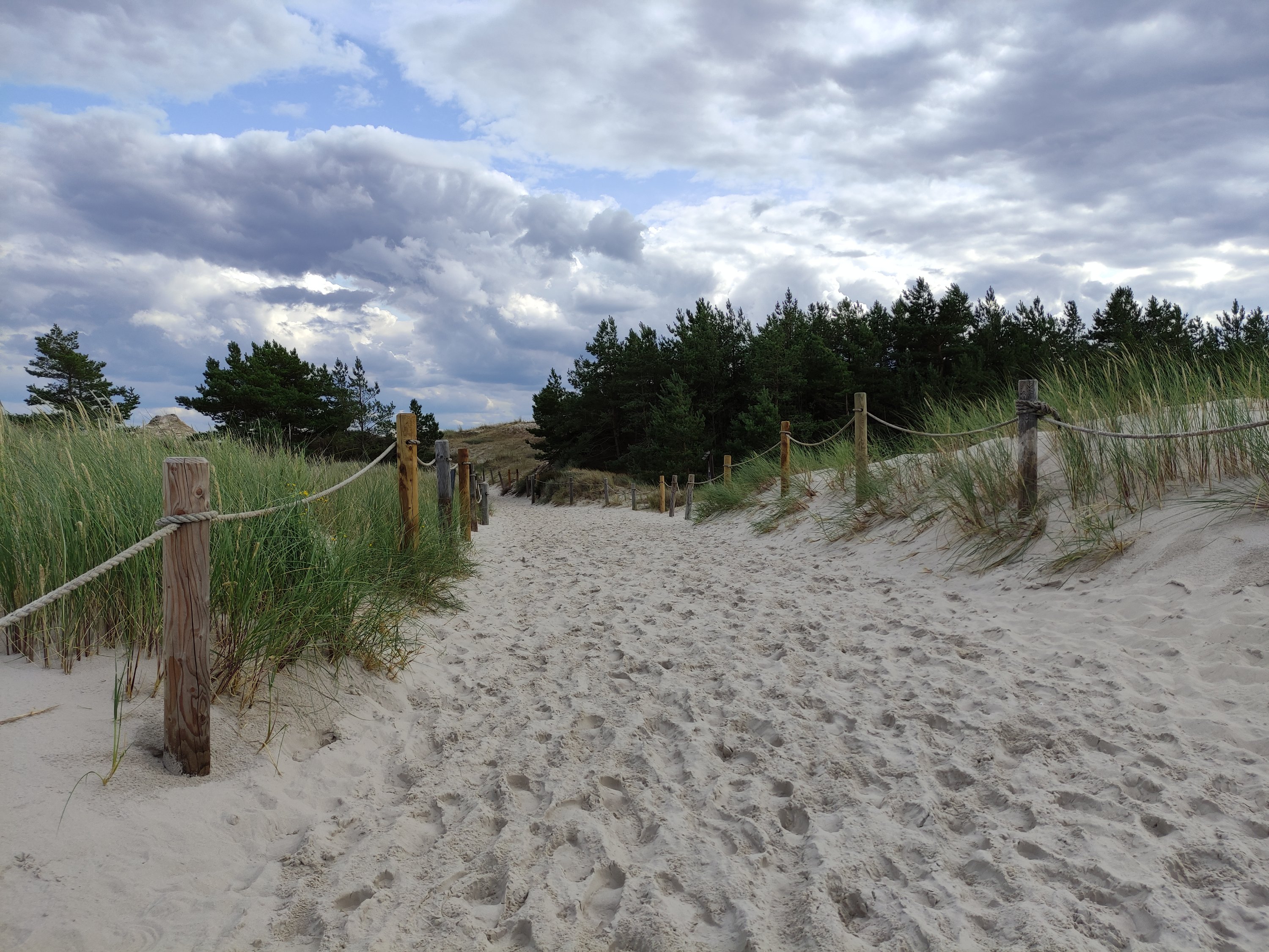 Am Abend schaute ich mir die Route für den nächsten Tag an: es sollte am Anfang wieder durch einen Wald gehen und das Oberflächenprofil bei Komoot sagte wieder losen Untergrund voraus. Irgendwie hatte ich schon so eine Vorahnung, dass die ersten Kilometer an diesem Tag sehr anstrengend werden könnten und ich überlegte, ob ich nicht von dem Ostseeküstenradweg abweichen und über kleinere Nebenstraßen über die Dörfer fahren sollte. Da jedoch nach ca 12 km ein kleiner Abzweig von dem Weg durch den Wald zu den Dörfern vorhanden war, wollte ich dem Ostseeküstenradweg eine Chance geben. Diese Entscheidung habe ich schnell bereut und sehnte mir schon nach Kurzem den Abzweig zu den Dörfern herbei. 😀
