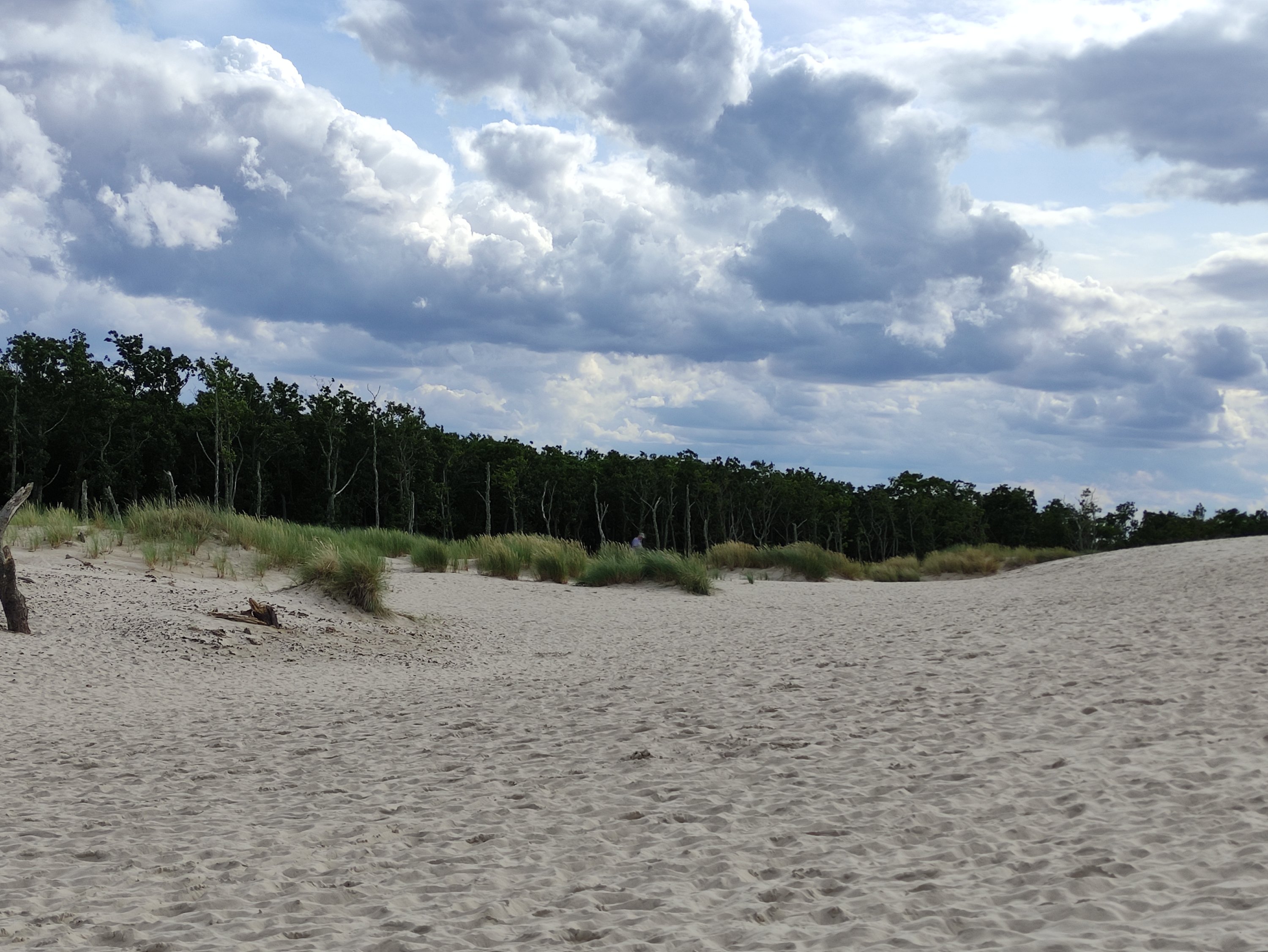 Nach 10km Fahrt durch den Wald, tiefem Sand und einigen Schiebepassagen kam ich in Leba an. Nach einer kleinen Stärkung, Zeltaufbau und Dusche ging es mit dem Rad weiter in Richtung Wanderdüne. Hierzu kann man in Leba entweder ein elektrisches, etwas größeres Golf Caddy nutzen, das einen dann zur Düne kutschiert oder man fährt die 9km mit dem Rad oder man geht zu Fuß.