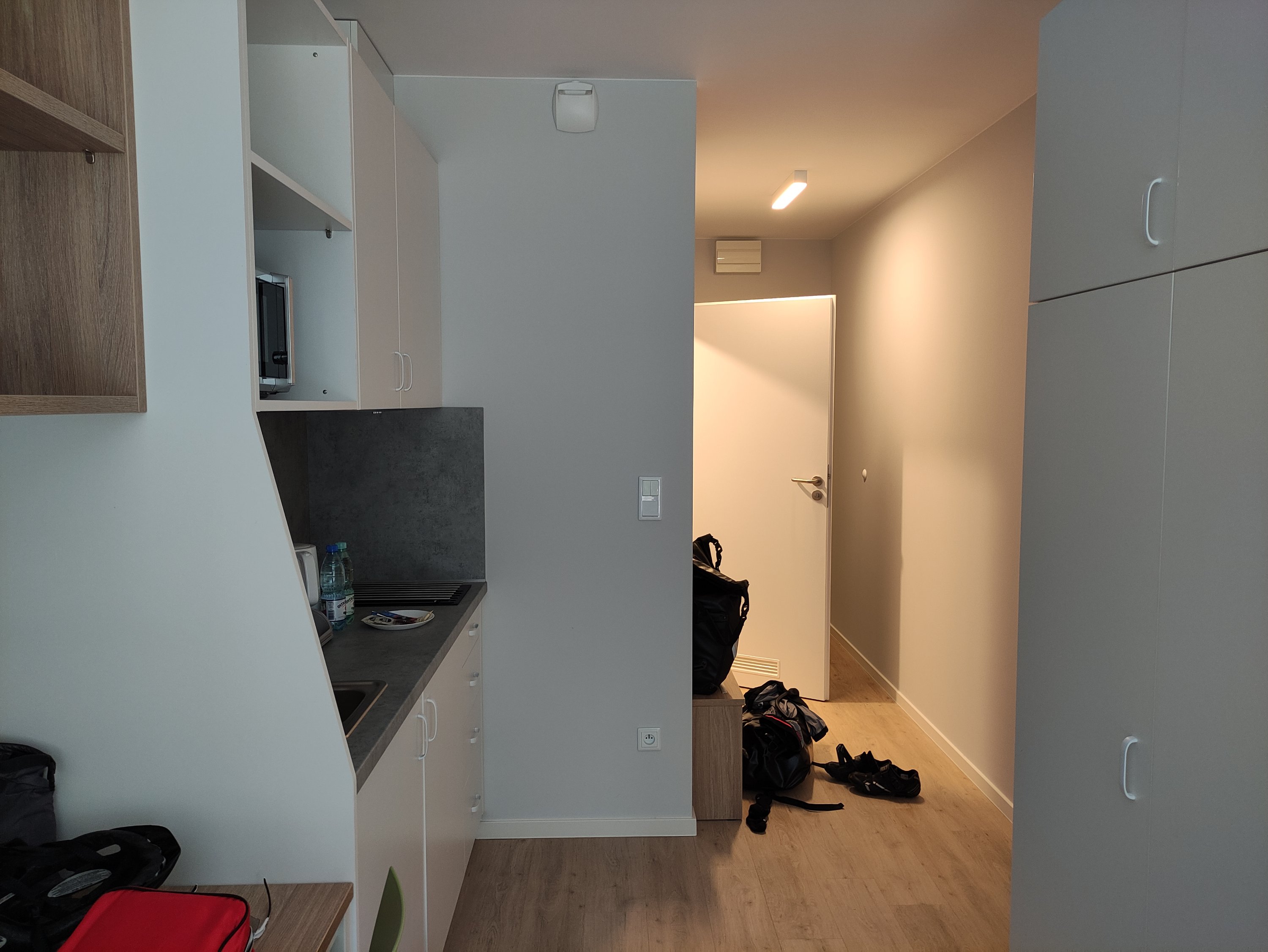 Zwischendrin fing es immer mal wieder kurz an zu regnen, aber die Regenschauer habe ich gut bei Kaffee und Kuchen in einem Café und beim Aufpumpen meiner Räder an einer Tankstelle ausgesessen, sodass es dann auf den letzten Kilometern bis zur Unterkunft im Trocknen weitergehen konnte. Als Unterkunft hatte ich mir ein kleines Appartment im Studentenwohnheim genommen. Man hat hier alles was man braucht: eine kleine Küchenzeile, eigenes Bad, Bett, Schreibtisch, Schrank, gute Internetverbindung und im Keller gibt es auch Waschmaschinen und Trockner – natürlich zu Studentenpreisen 😉 . Was braucht man mehr?!