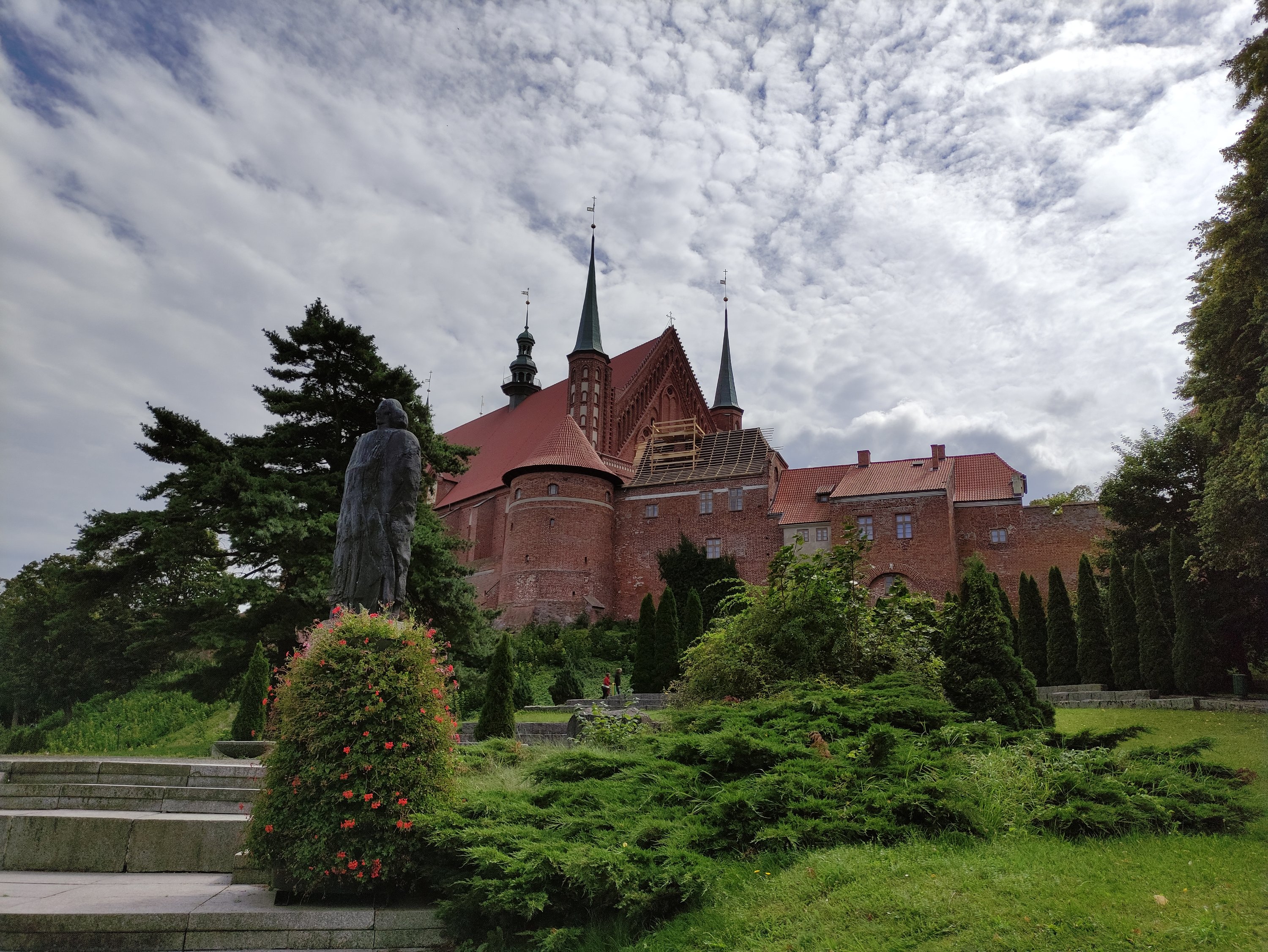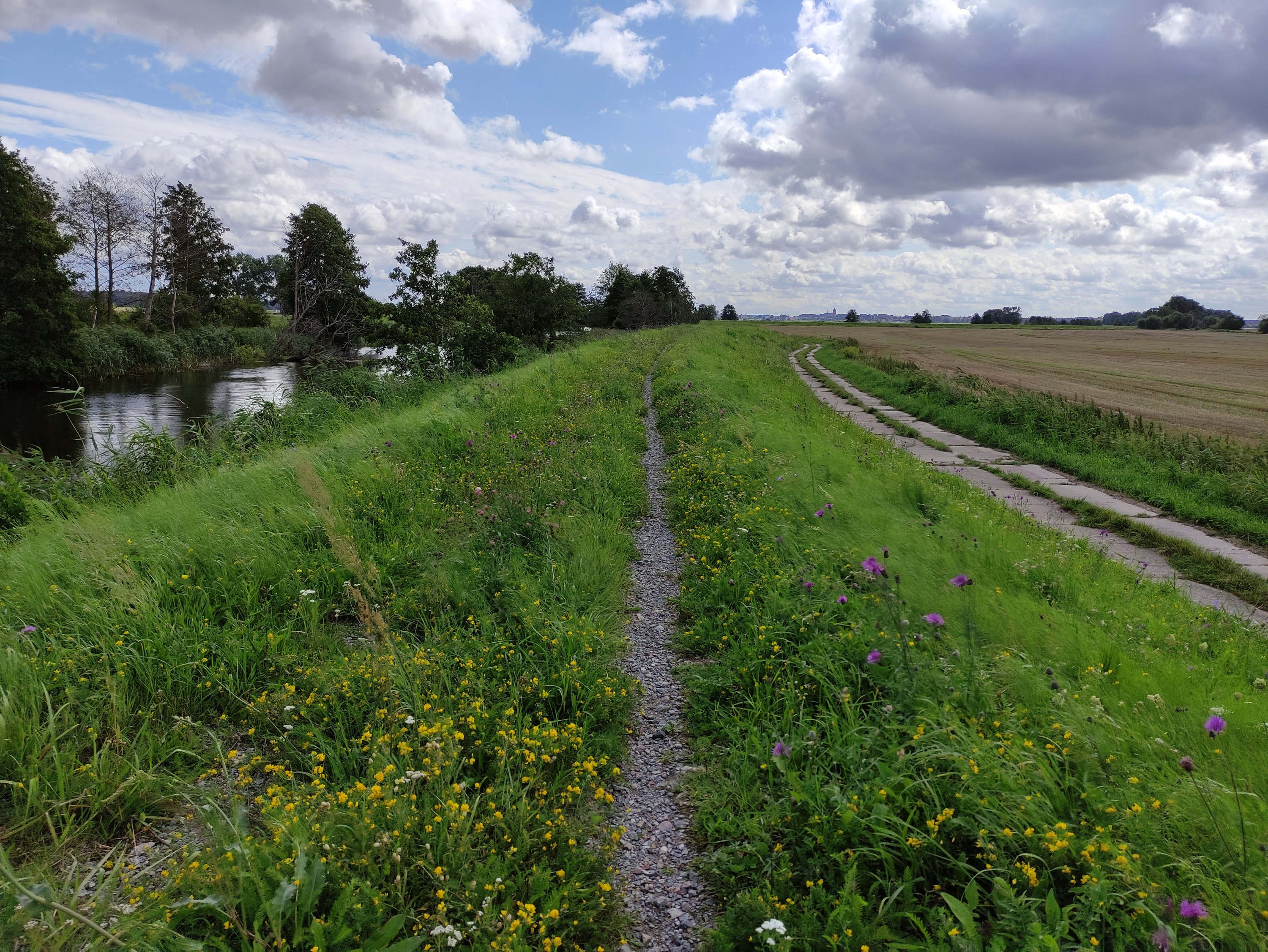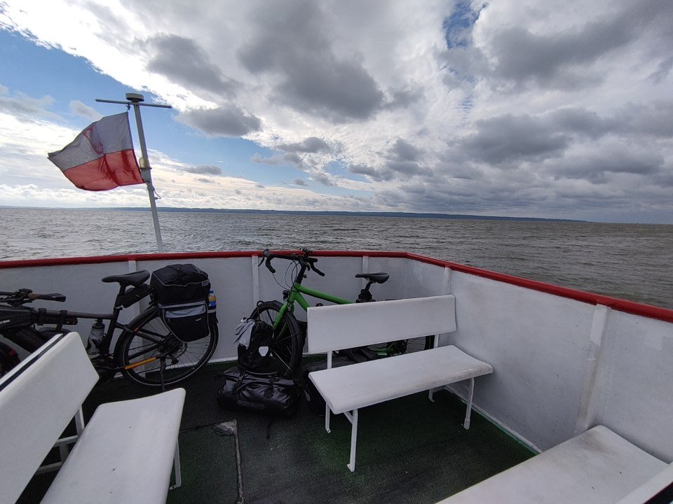 Am nächsten Morgen, packte ich zeitig mein Zeug zusammen und machte mich auf den Weg zum Hafen, da ich heute mit der Fähre wieder übersetzen musste. Dort angekommen, hieß es jedoch leider, dass die Fähre heute aufgrund von starkem Wind nicht fährt. Jedoch gab es ein größeres Schiff, dass 45min später trotzdem übersetzte. Gegen Mittag nach 1.5h Fahrt kam ich in Frombork, der Stadt in der auch Nikolaus Kopernikus lebte, an und startete dort meine Tour auf dem Green Velo. Generell kann ich nun nach den ersten Tagen auf dieser Radroute sagen, dass sie super ausgeschildert ist und deutlich bessere Wege zu bieten hat als der Ostseeküstenradweg, wenn auch teilweise etwas abenteuerlich. So führte am ersten Tag der Weg direkt auf dem Damm entlang durch ein Meer von Wildblumen. 🙂 Ansonsten geht es oft über geteerte Nebenstraßen durch kleine Dörfer oder über feste Waldwege und Schotterpisten. Es gibt aller paar Kilometer immer sogenannte MORs, d.h. kleine überdachte Raststellen und in den Orten kann man sich meistens in kleinen Lebensmittelläden mit Essen und Trinken versorgen.