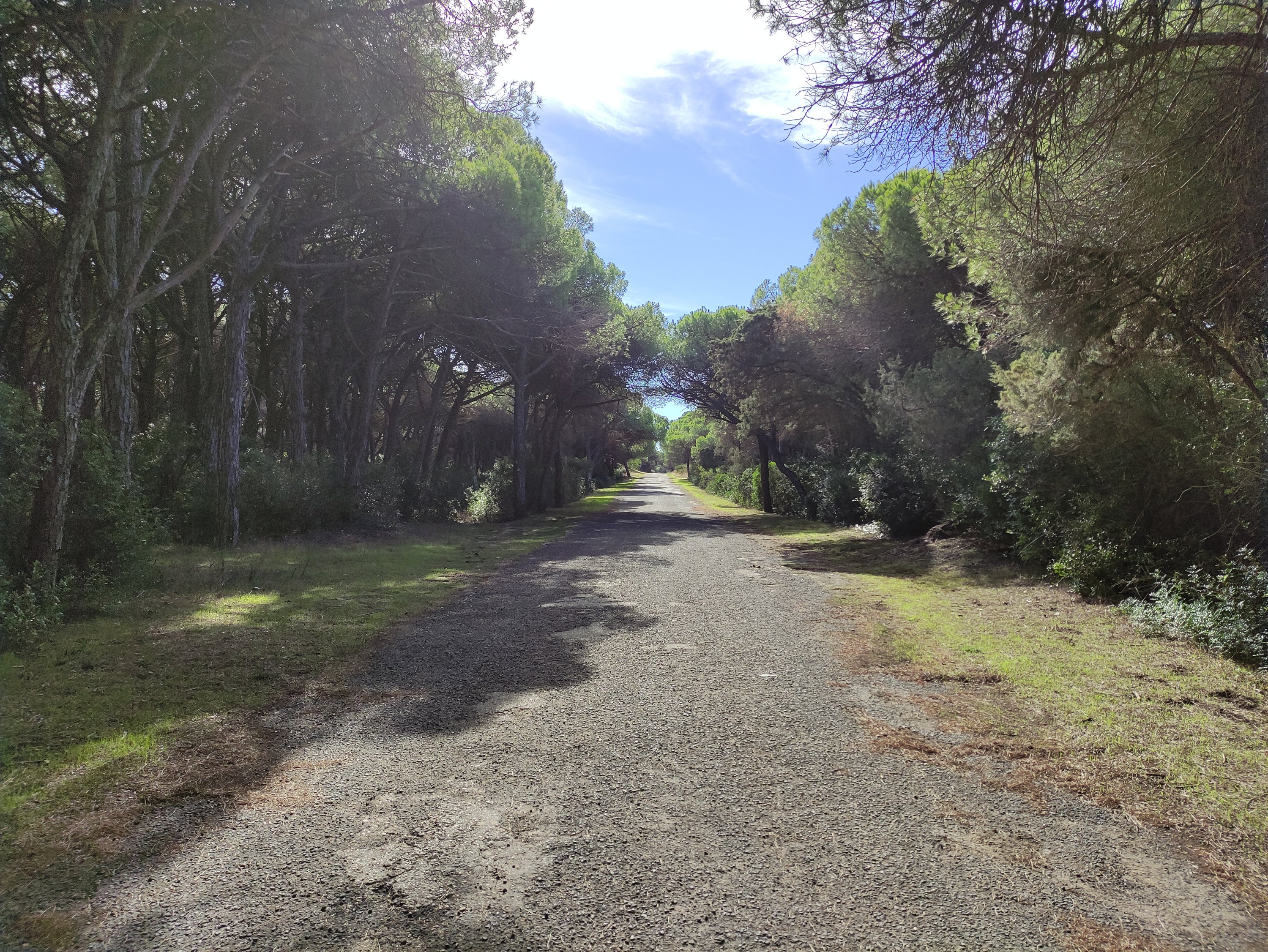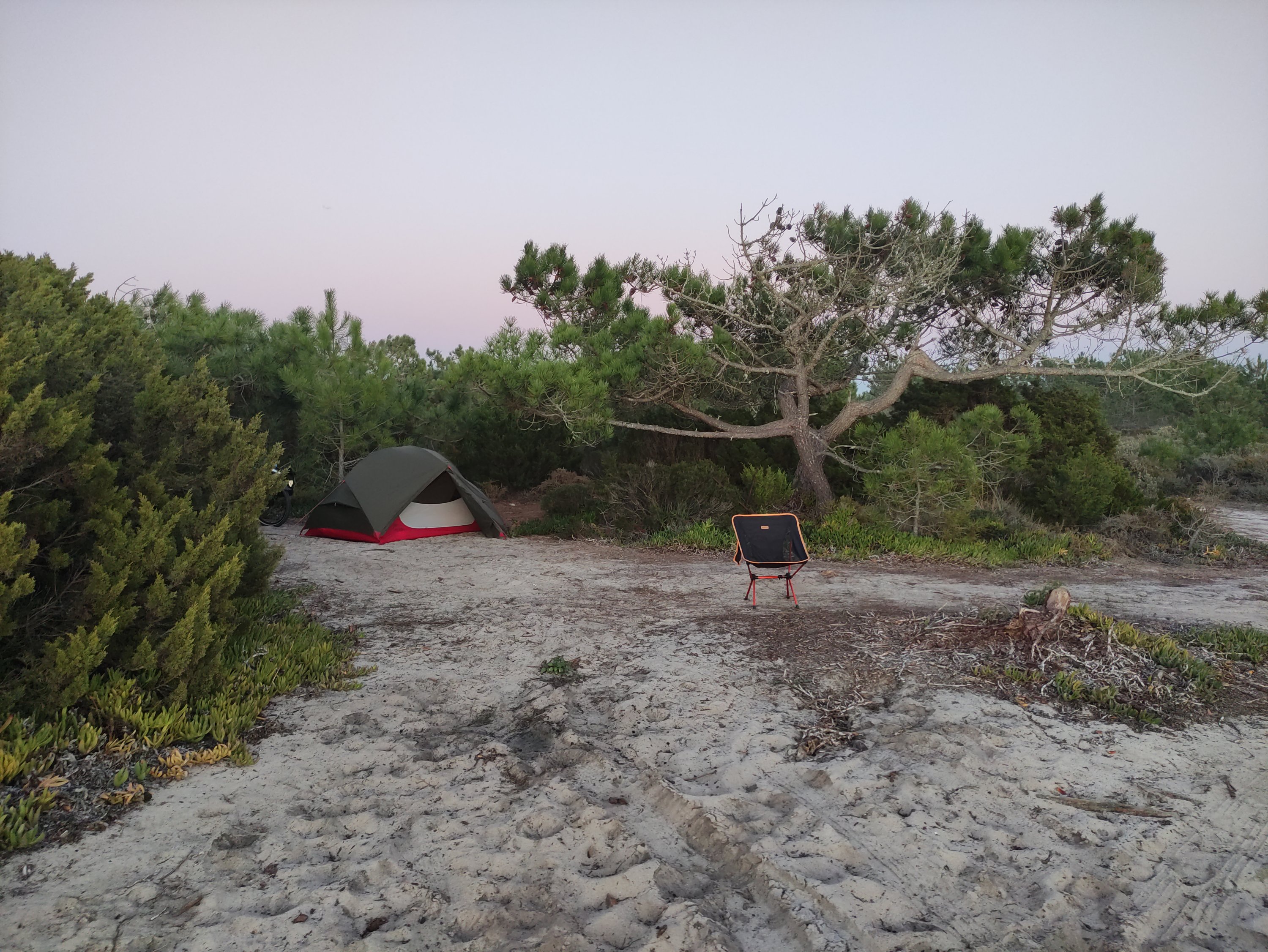 Die weitere Route führte mich zunächst über ruhige und abgelegene Straßen, später dann jedoch durch ein dicht besiedeltes Stadtgebiet, in dem es mit dem ganzen vielen Verkehr entsprechend anstrengend war zu fahren. Am Nachmittag erreichte ich dann wieder den Atlantik und schlug mein Nachtlager in der Nähe des Strandes unter einem großen Pinienbaum abseits des Weges auf. Es war meine erste Wild-Camping Erfahrung und so richtig konnte ich am Anfang nicht schlafen, da auch spät abends immer noch Autos zum Aussichtspunkt mit Treppe zum Strand gefahren sind. Anscheinend nutzen junge Leute diese Sand- und Schotterpiste auch, um mal so richtig den Motor des Autos aufheulen zu lassen und zu testen, wie schnell das Auto beschleunigt. Nachdem dann aber Ruhe einkehrte, hab ich eigentlich gut geschlafen.