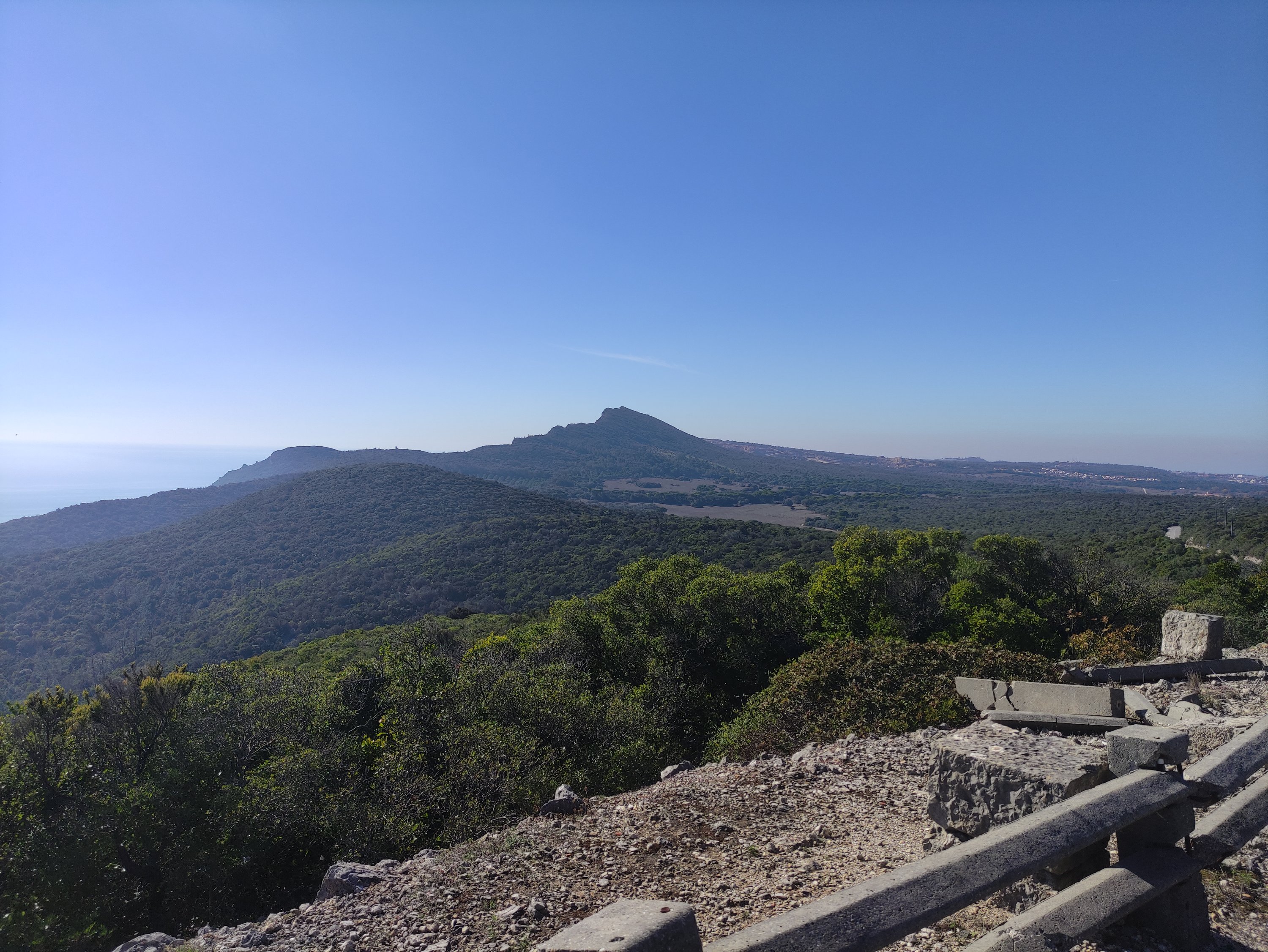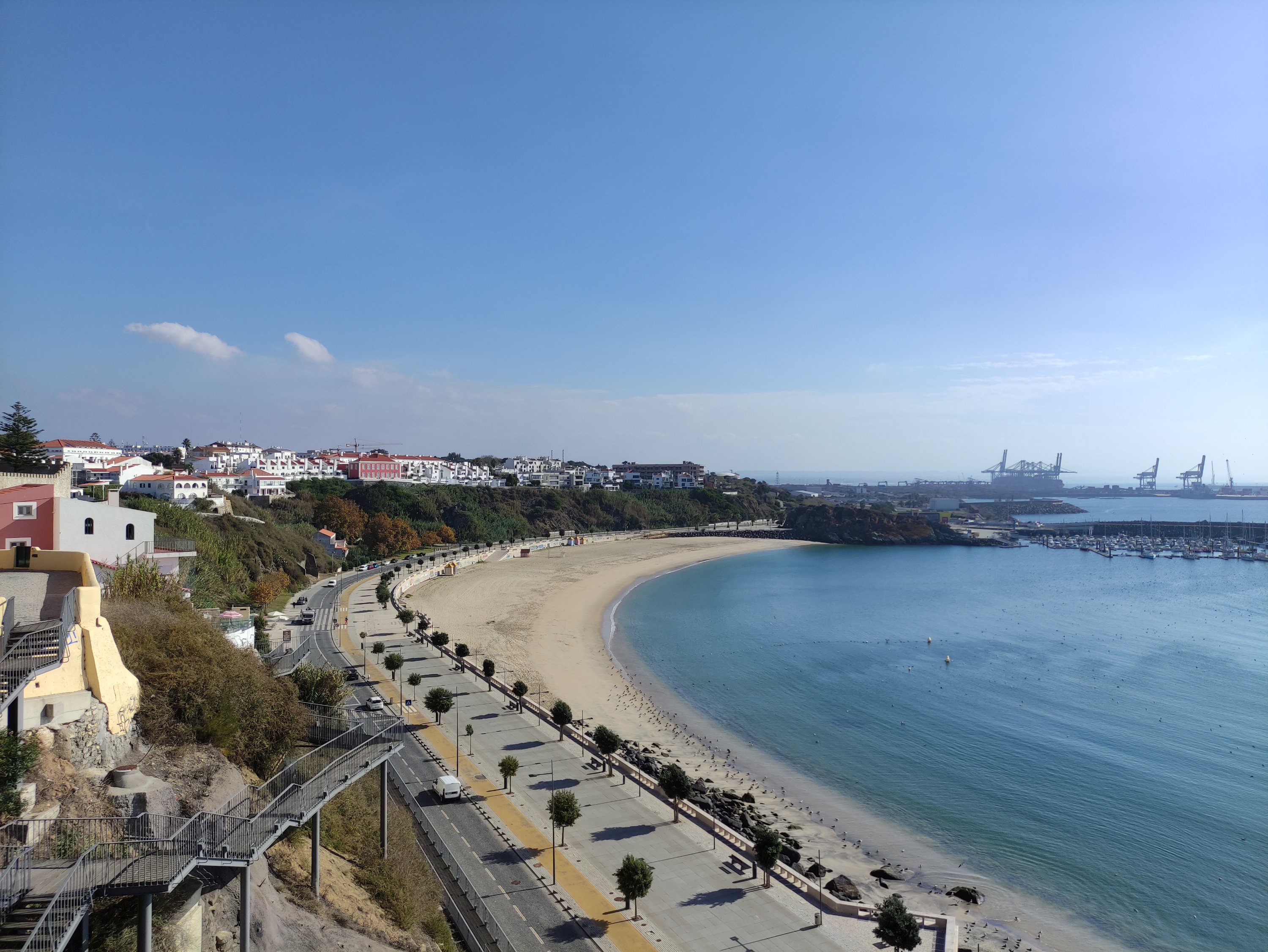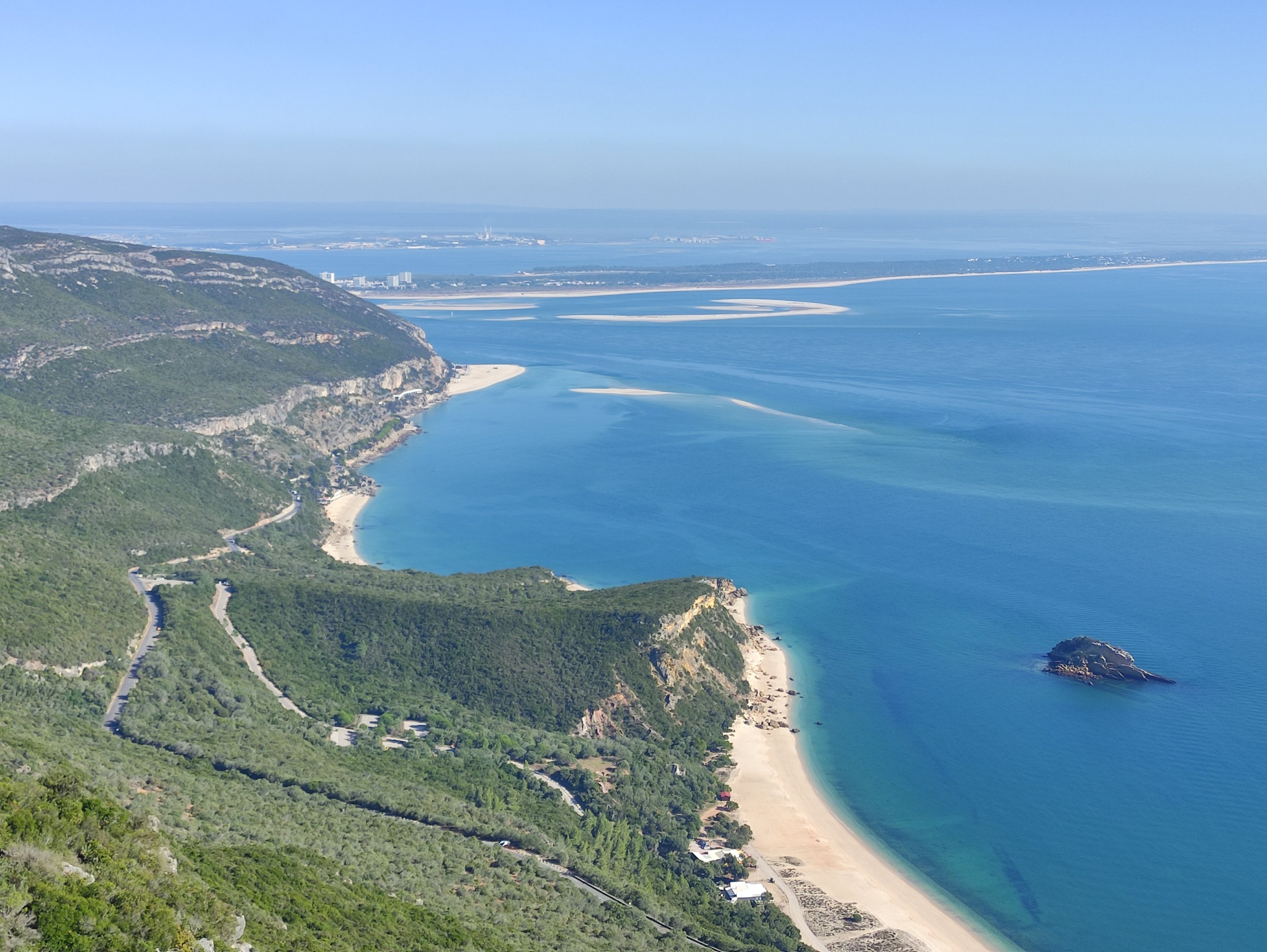 Auf dem Weg nach oben, musste ich mich mit voller Kraft gegen meinen Lenker stemmen, um das Rad überhaupt nach oben schieben zu können. Dabei lief der Schweiß übers Gesicht und ich musste aller paar hundert Meter kurz anhalten und Pause machen. Die mich überholenden Autos und Mopeds feuerten mich mit Hupen und dem Daumen nach oben an. Am höchsten Punkt des Berges lag mir Setúbal und die Halbinsel Tróia mit seinem Strand und den vorgelagerten Sandbänken im türkisfarbenen Ozean zu Füßen.
