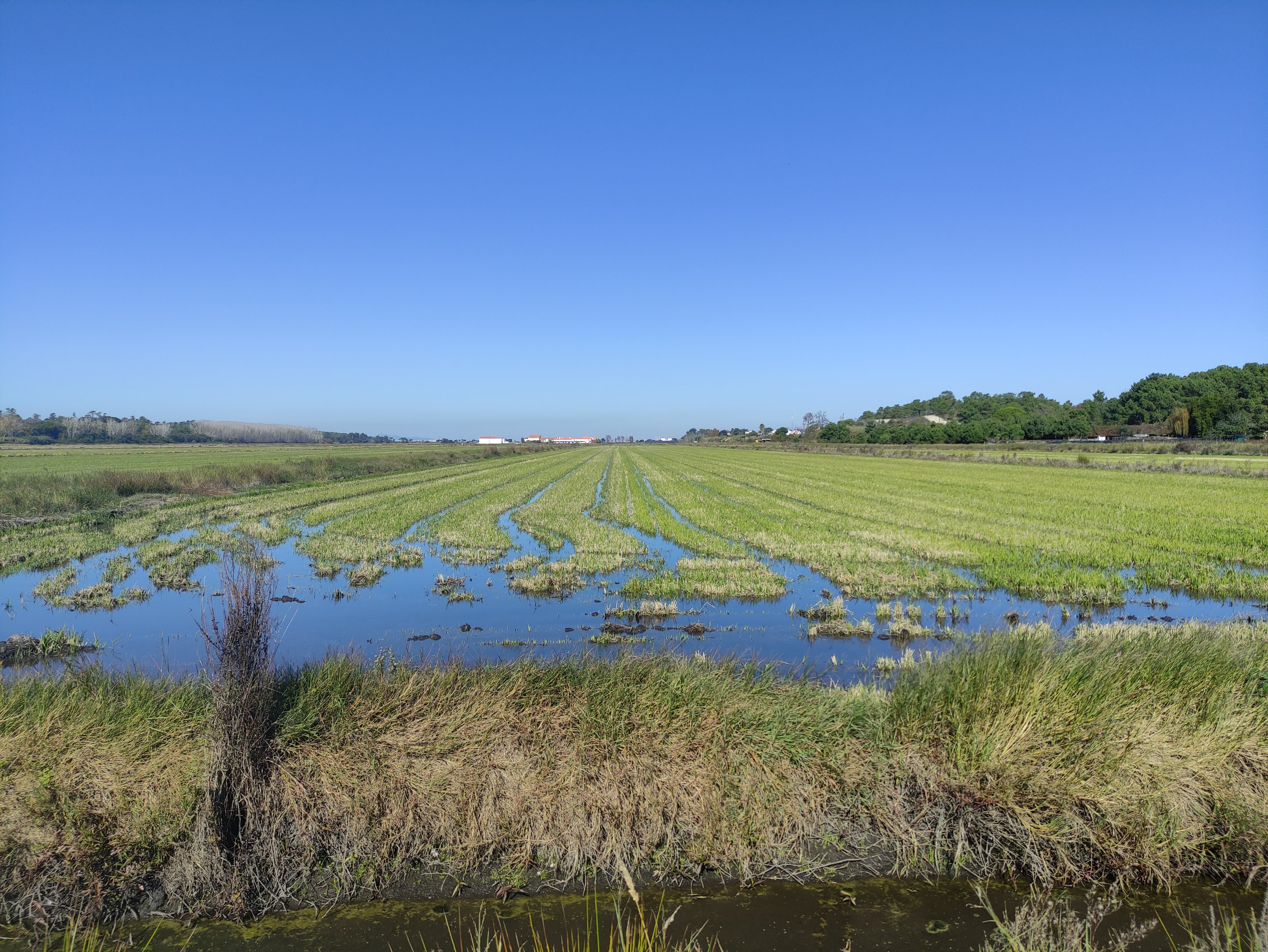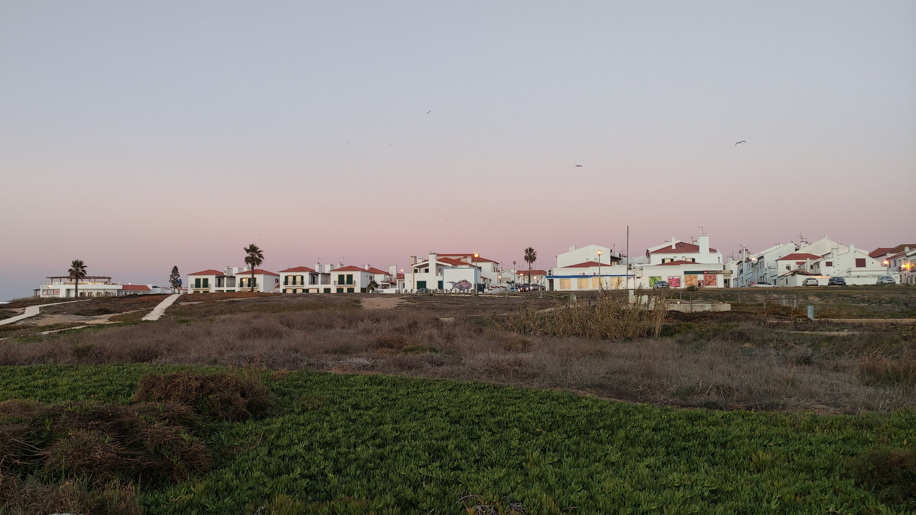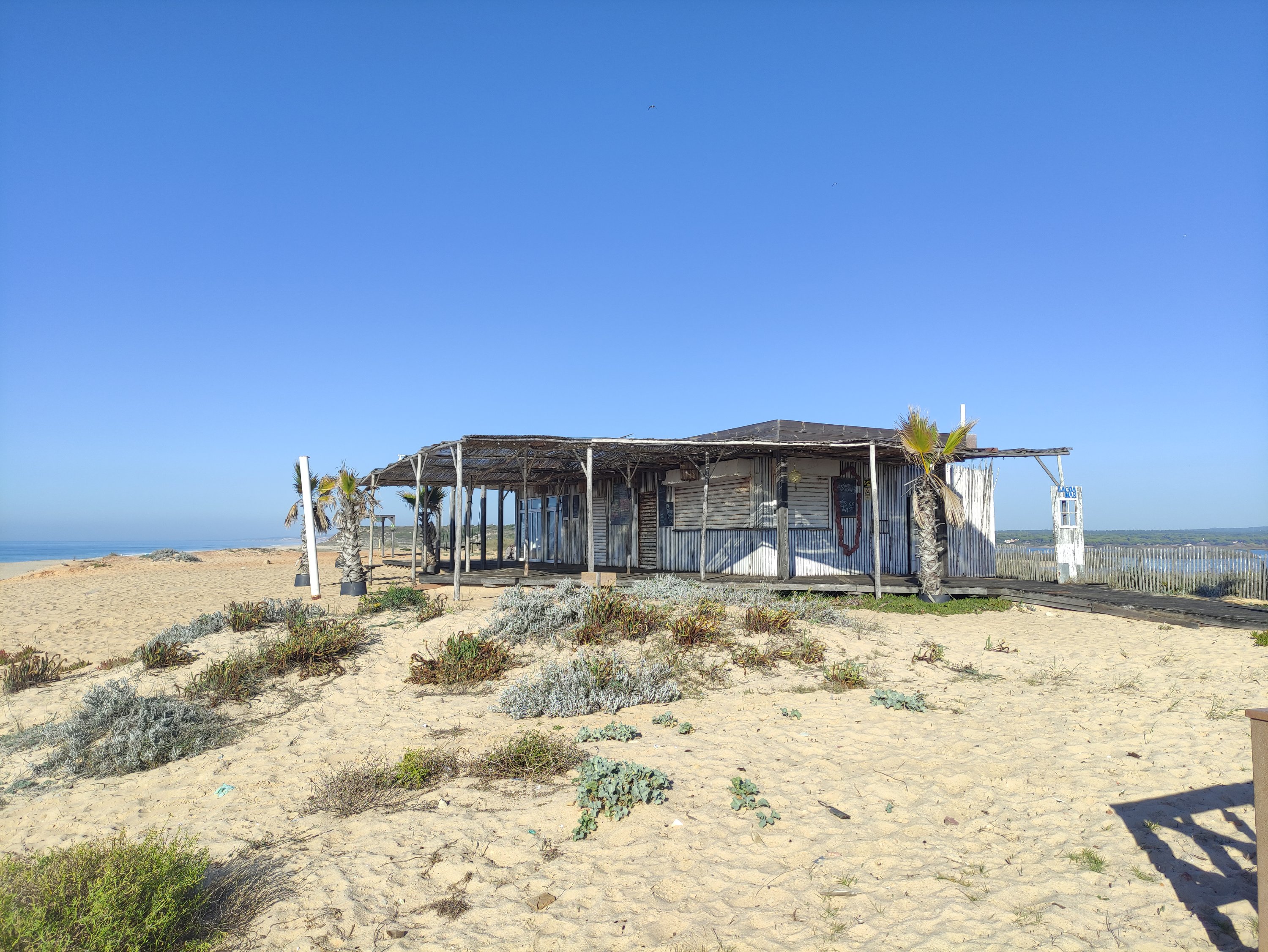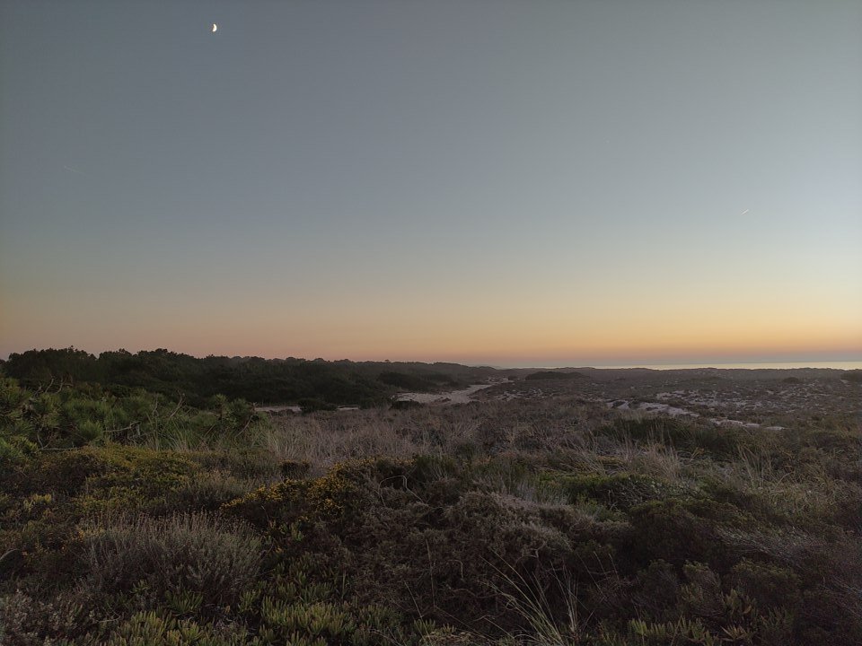 Die nächste Etappe startete vormittags wieder mit einer Fährfahrt. Dieses Mal setzte ich auf die Halbinsel Tróia über. Nach den ersten Kilometern entlang einer Straße führte mich an diesem Tag meine Etappe durch Reisfelder bis ich schließlich am frühen Nachmittag am Strand von Melides ankam. Da es in der Sonne sehr warm war, schnappte ich mir meine Picknickdecke, zog meinen Bikini an und legte mich an den Strand und ließ dort den Nachmittag ausklingen. An diesem Strand hatte der Atlantik schon eine sehr starke Brandung und so donnerten die Wellen nur so gegen den Strand. Am Strandzugang gab es sogar eine Dusche, sodass ich dann kurz vor Sonnenuntergang frisch geduscht hinter den Dünen mein Zelt aufbaute und dann den Sonnenuntergang genoss.
