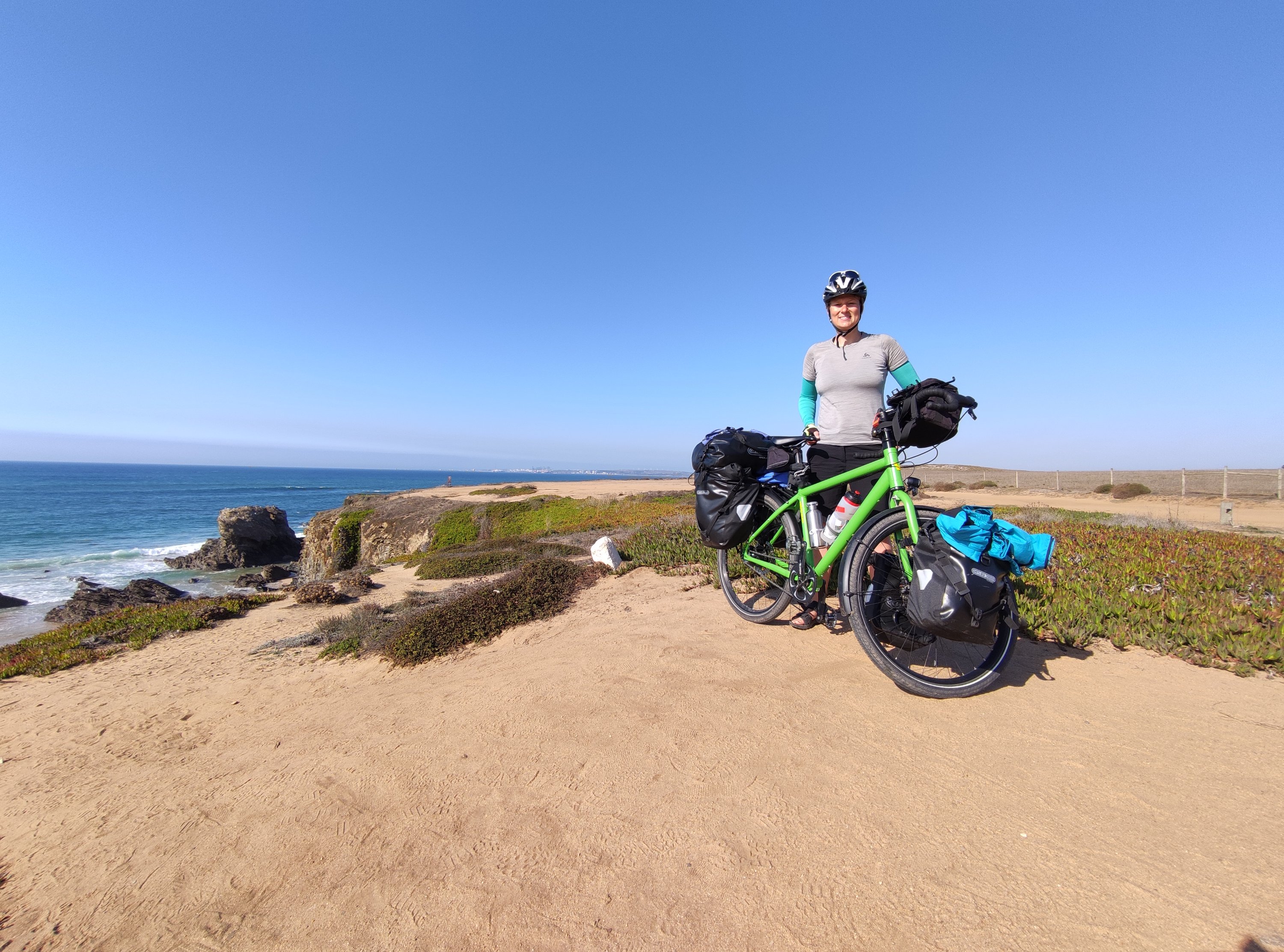 Auf meiner Schlussetappe nach Zambujeira do Mar, wo mein Campingplatz für diese Nacht war, traf ich eine andere Radreisende. Sie kam vor 3 Monaten aus Chile nach Portugal, um hier zu arbeiten. Nachdem sie ein wenig Geld zusammengespart hatte, kaufte sie sich ein gebrauchtes Rad und Radtaschen und fährt nun vom Süden in den Norden von Portugal.