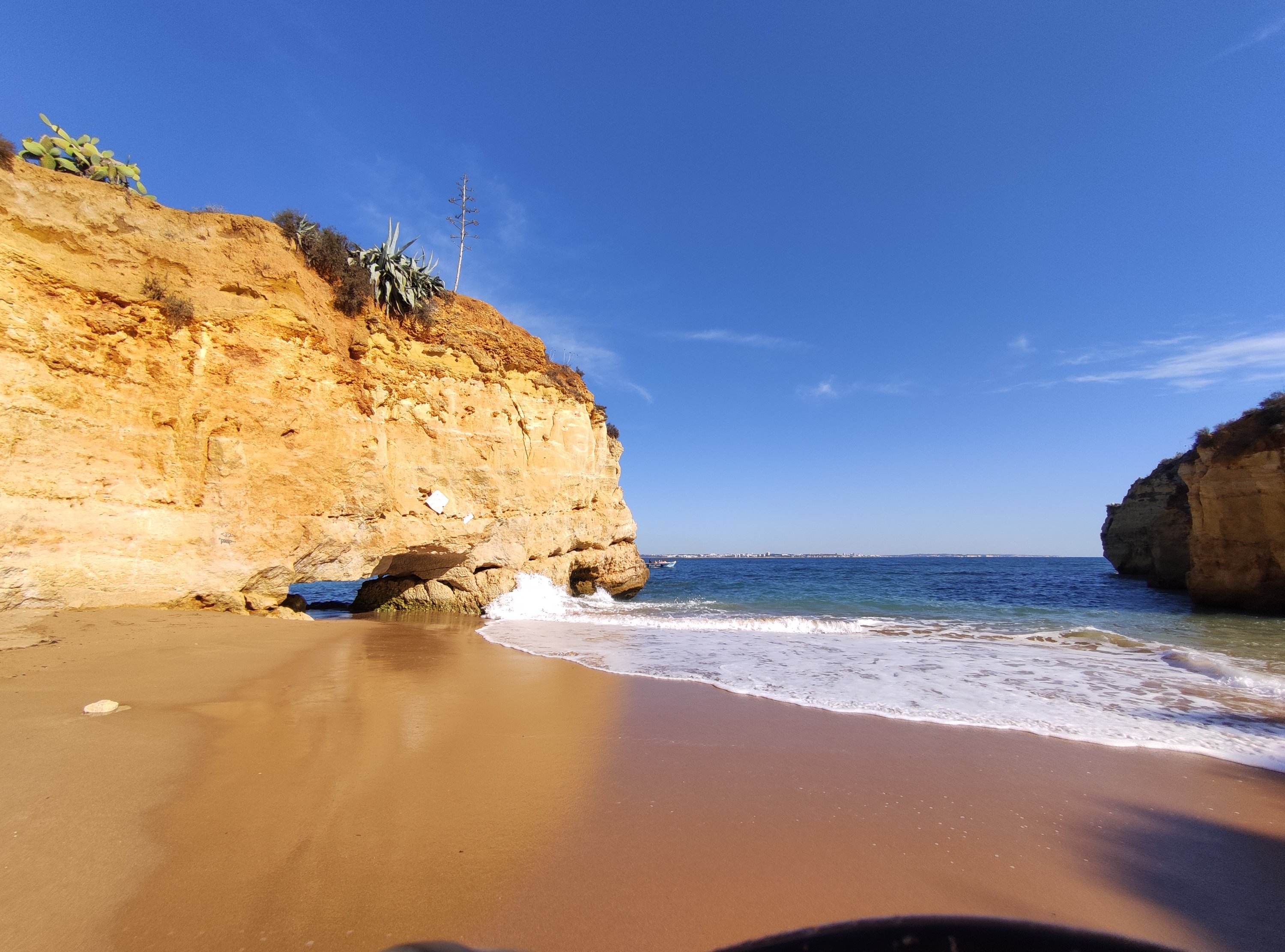 In Lagos wollte ich das noch tolle Wetter genießen und hatte mir deshalb für 3 Nächte ein kleines Ferienappartement in einem Hotel gegönnt. Da gerade Nebensaison ist, ist in den Hotelanlagen kaum was los und die Zimmer sind sehr günstig. Nachdem meine Beine und vor allem meine Knie am nächsten morgen noch ordentlich von den Höhenmetern schmerzten, standen Dehnungsübungen auf dem Plan und ich funktionierte kurzer Hand eine Wasserflasche zur Blackroll um und bearbeitete damit meine Faszien in den Beinen. Man muss nur kreativ sein – geholfen hat es auf jeden Fall. 😉