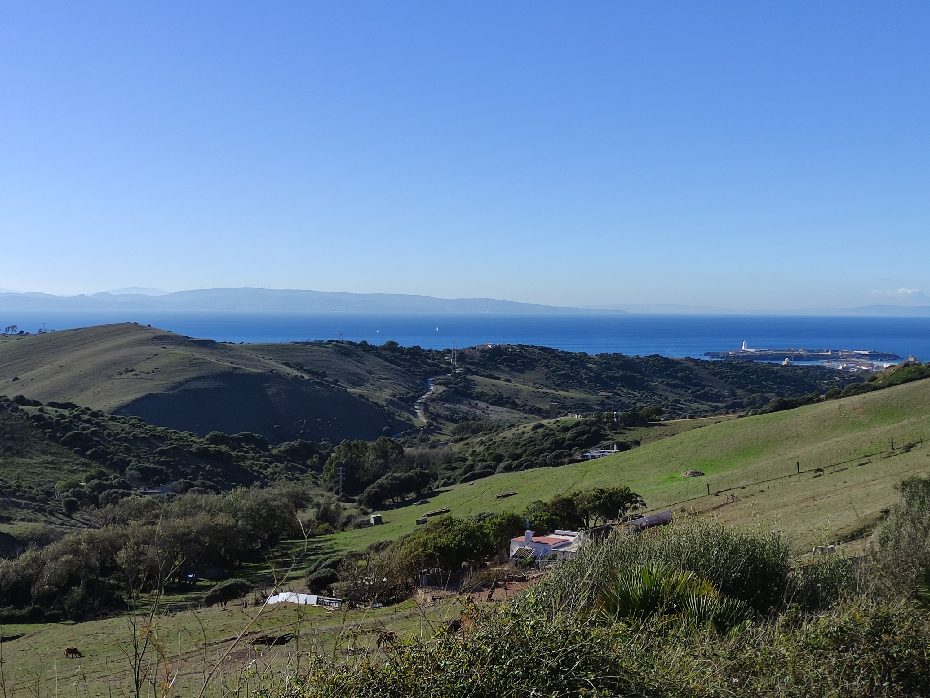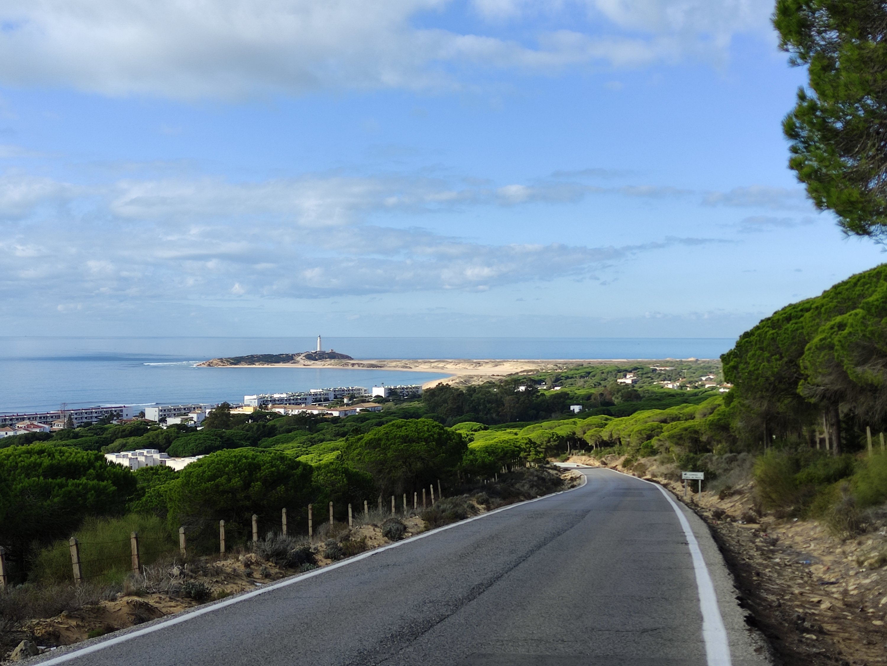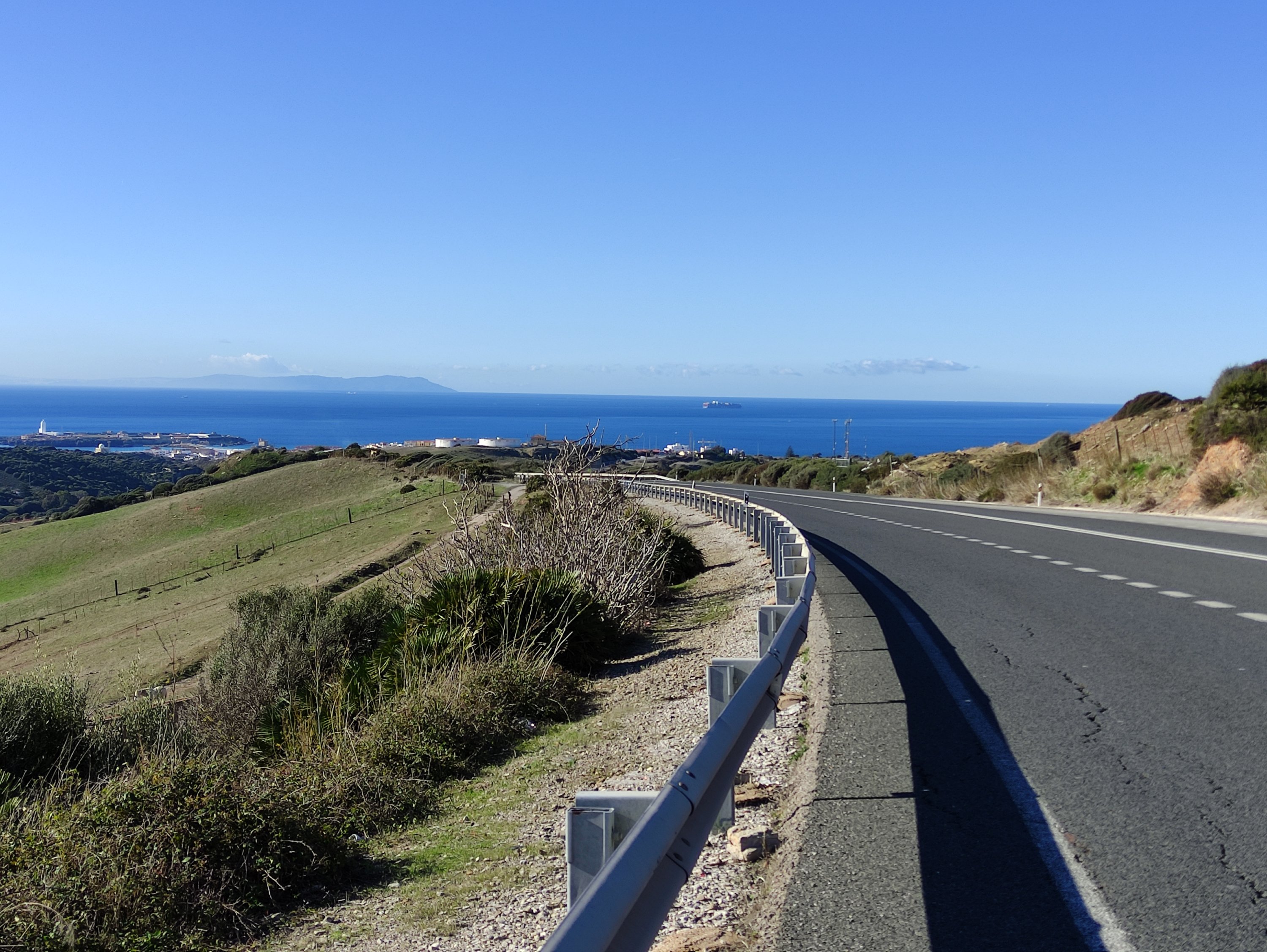 Für den nächsten Tag stand mir wieder eine kleine Bergetappe bevor. Es ging direkt in Tarifa los und ich arbeitete mich langsam aber stetig auf dem Seitenstreifen den Berg hoch. Dabei lohnte es sich öfters mal einen Blick über die Schulter zu werfen, denn da eröffnete sich mir ein toller Ausblick auf Tarifa, die Umgebung und das Meer.