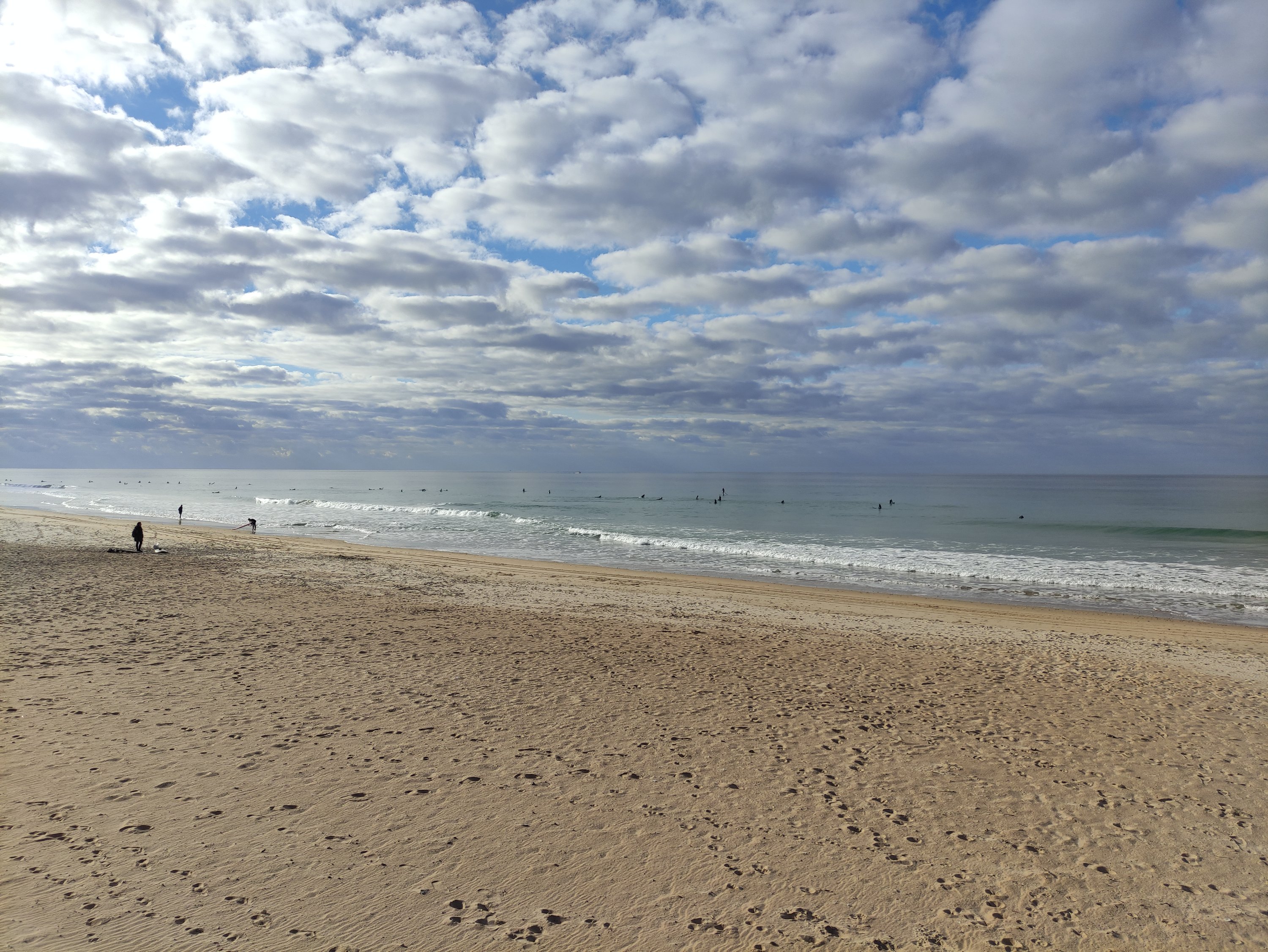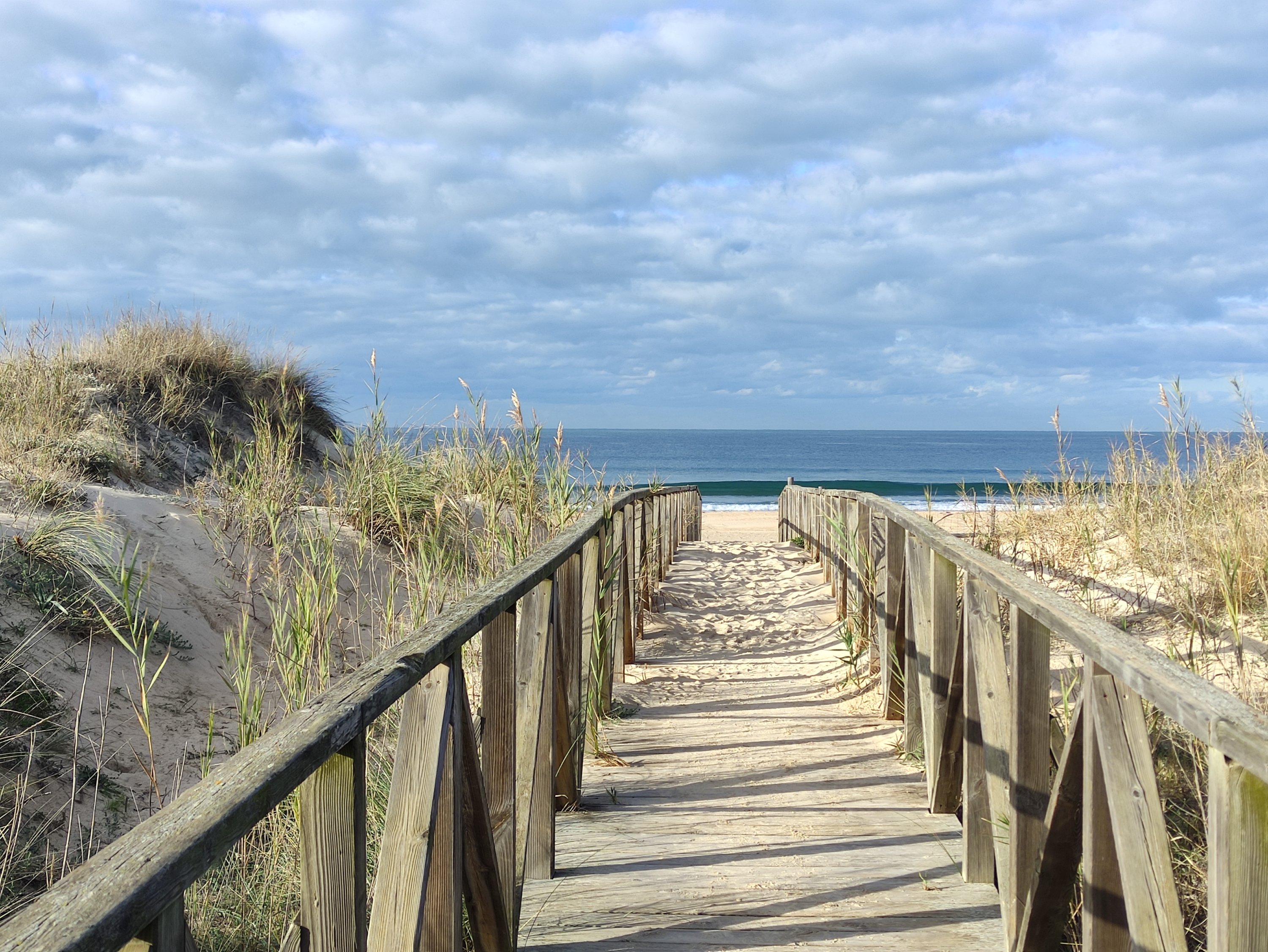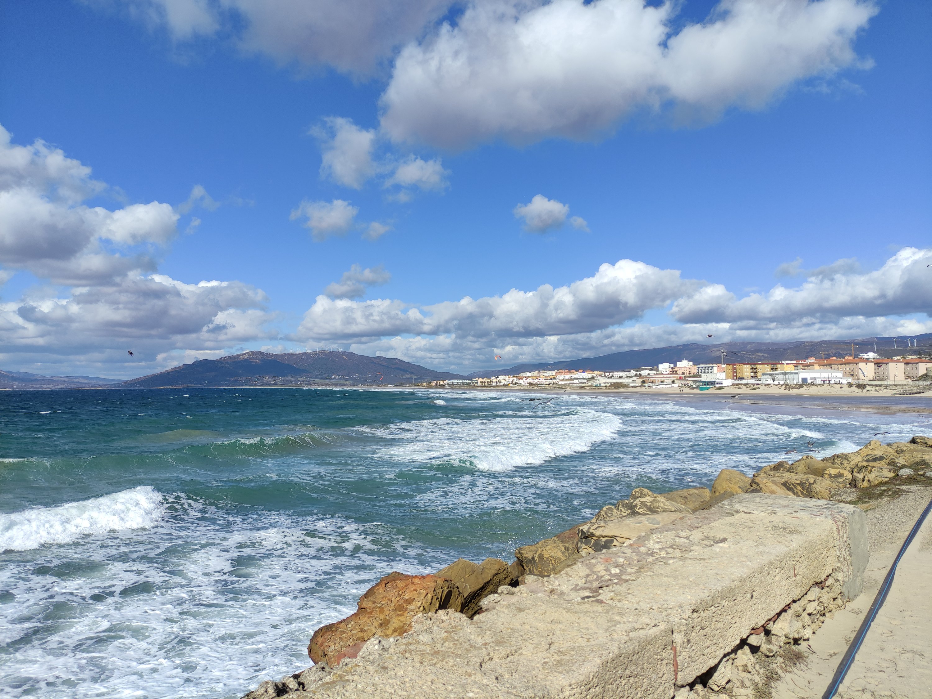 Am nächsten Tag ging es für mich weiter auf dem Rad mit Tarifa als Tagesziel, wo das Mittelmeer und der Atlantik ineinander übergehen. Die Etappe war echt super schön. Zum einen weil es sehr oft tolle separierte Radwege gab z.T. mit Blick auf den Atlantik und zum anderen führten auch immer wieder Holzstege direkt zum Strand. In El Palmar de Vejer, beobachtete ich bei einem Tee vom Holzsteg aus, die vielen Surfer, die im Wasser auf die perfekte Welle warteten.