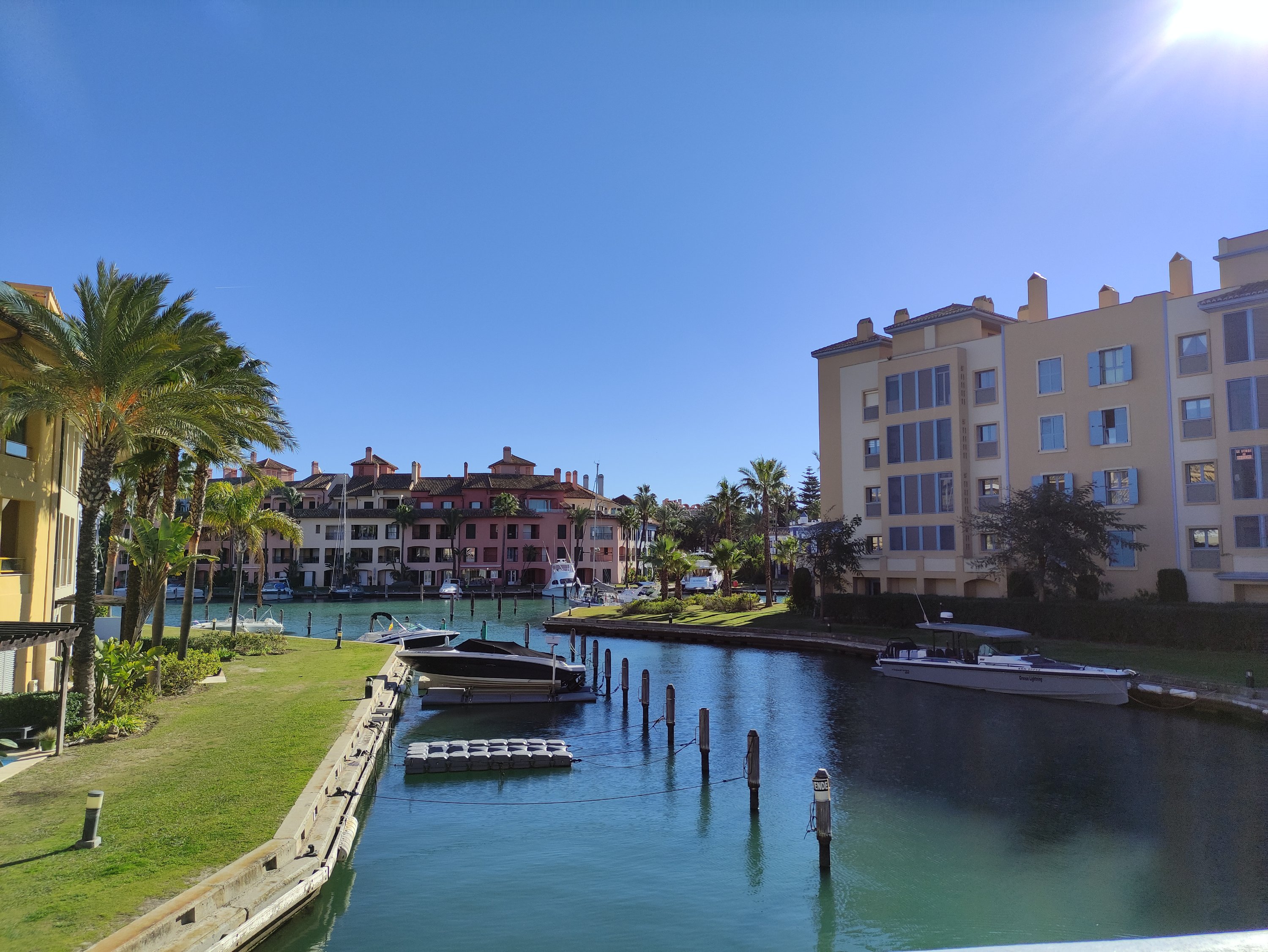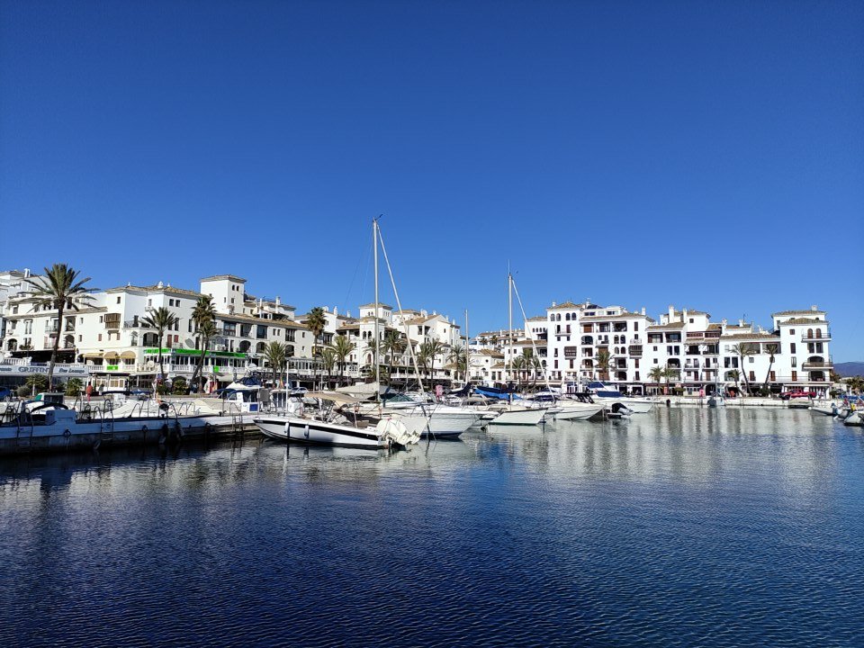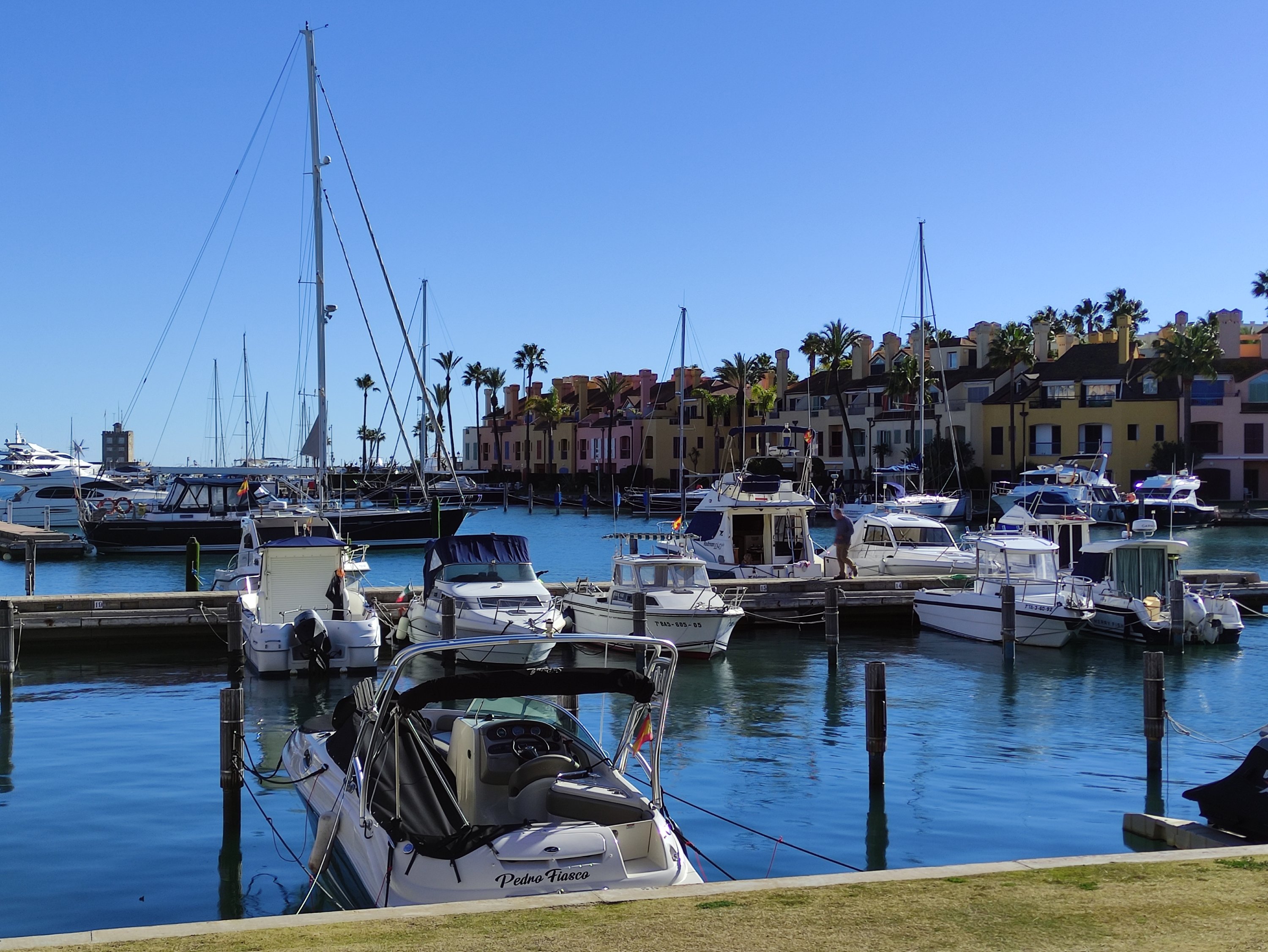 Anschließend ging es dann zurück an die Küste. Ich kam von einer Nebenstraße, bog im Kreisverkehr in ein Wohngebiet ab und war schon überrascht, da sich vor mir ein Wachhäuschen mit Schranken befand. Im ersten Moment dachte ich, dass man hier nicht durchfahren kann, aber das Wachpersonal öffnete mir die Schranke als sie mich sahen und ich konnte ohne Probleme durchfahren. Kurze Zeit später wusste ich auch warum – ich war in einem Viertel der Reichen und Schönen gelandet. Überall fette Villen mit hohen Zäunen oder Hecken, gepflegte und palmengesäumte Straßen und ein Luxusauto nach dem anderen. Als ich wieder am Meer war, gab es dazu dann auch noch den passenden Yachthafen und Wohnkomplexe mit einer Art Lagune zwischen den Gebäuden, in der es dann auch direkt die Bootsanlegestelle am Gebäude gab. 🙂 Ich merkte deutlich, dass ich nicht mehr weit von Marbella entfernt war.
