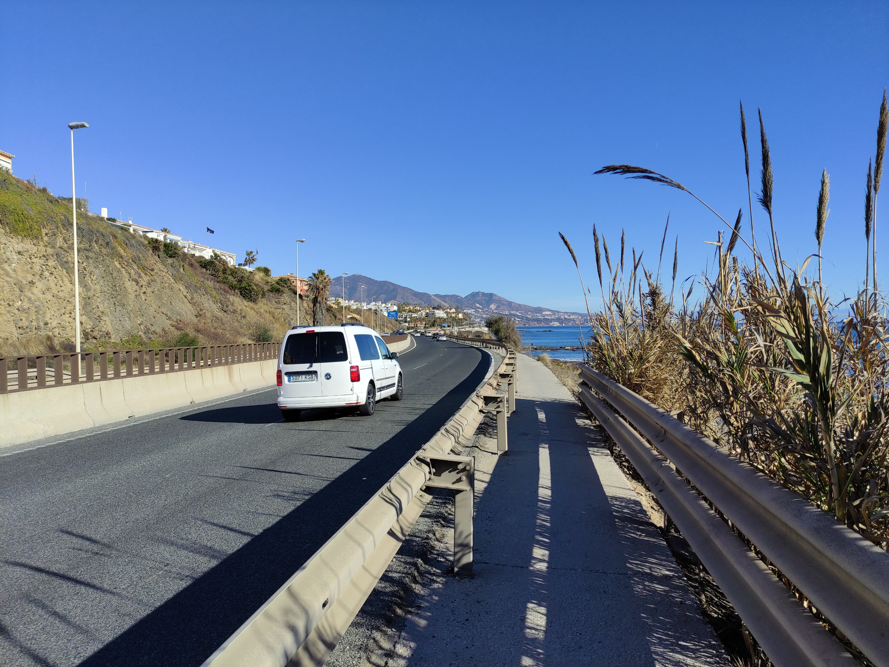 Für mich ging es dann weiter Richtung Estepona, wo ich mir einen Campingplatz rausgesucht hatte. Leider muss ich in dem Abschnitt von Spanien immer wieder auf dem schmalen Seitenstreifen auf der Schnellstraße fahren, da es oft keine andere Möglichkeit gibt: links die Berge, rechts das Mittelmeer und dazwischen gehen entlang der Schnellstraße die Ortschaften ineinander über. Da die Fahrt entlang der Schnellstraße laut und anstrengend ist, versuche ich wo immer es geht in den Orten entlang der Promenade zu fahren. Zu dieser Jahreszeit ist in den meisten Orten auch nicht so viel los, sodass man tatsächlich mit dem Fahrrad dort gut vorwärts kommt.